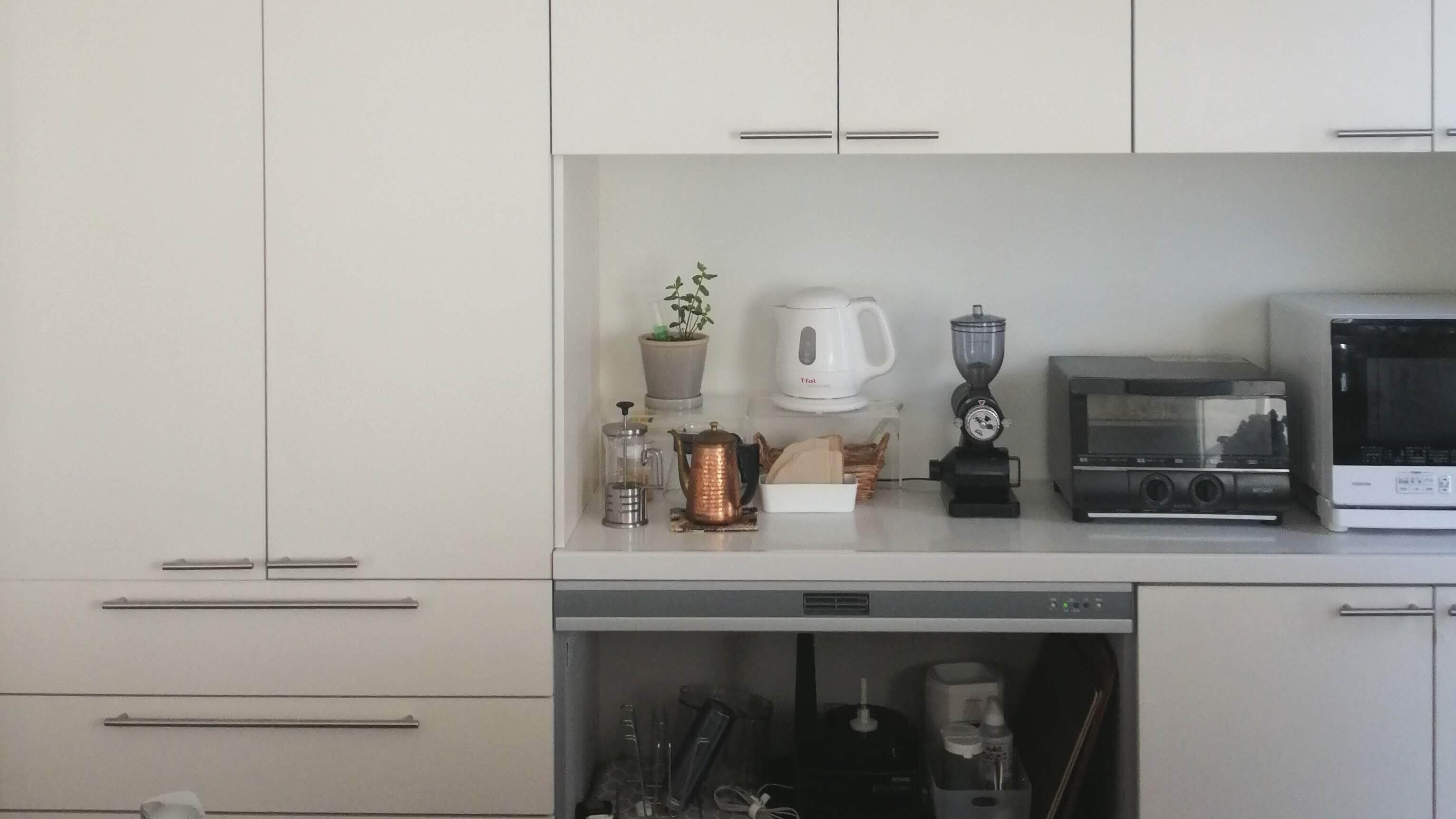 そこにはオーブンレンジ、電気ケトル、コーヒーグッズそしてトースター。よく使う物、お気に入りの物は出しっぱなしにしたいので、この場所から省きやすいのはトースターだと考えました。頻度や重さ的にも出し入れを考えても負担が少ないと考えたのです。