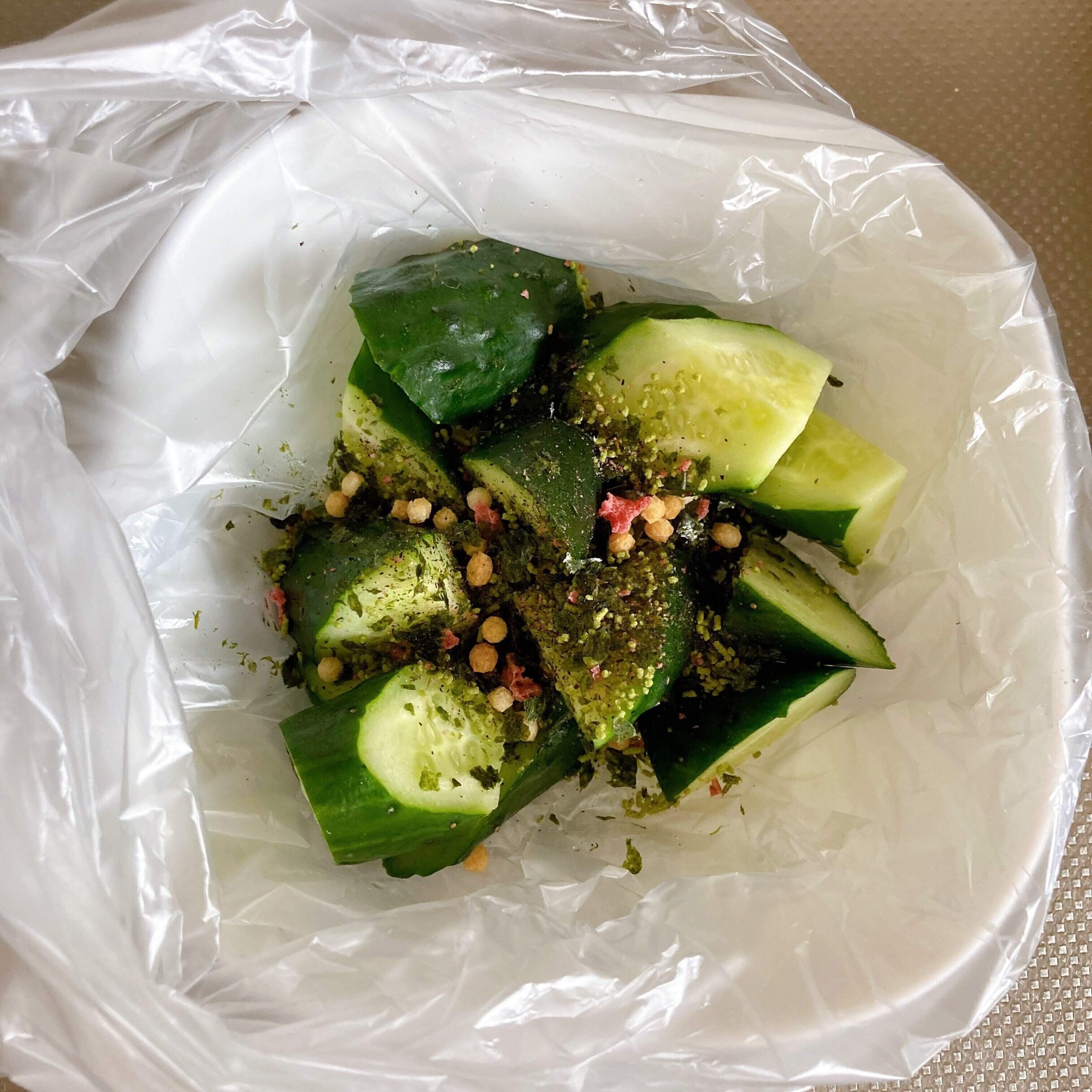 ポリ袋に、きゅうり・お茶漬けの素を入れ、全体的に和えたら5分置く。