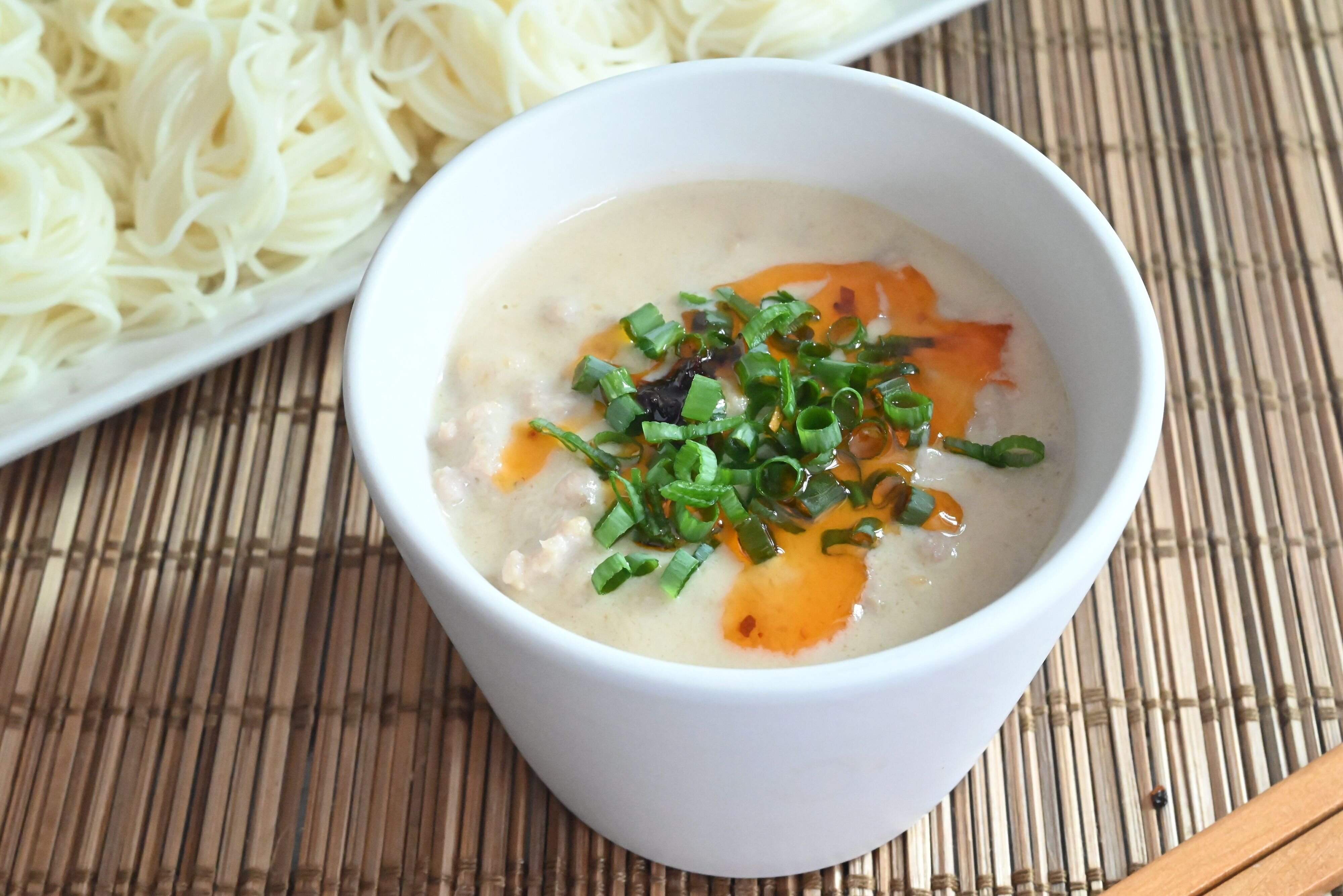 (5)(2)を加えてしっかり混ぜ合わせ、器に移して小口切りにした小ねぎを散らす。