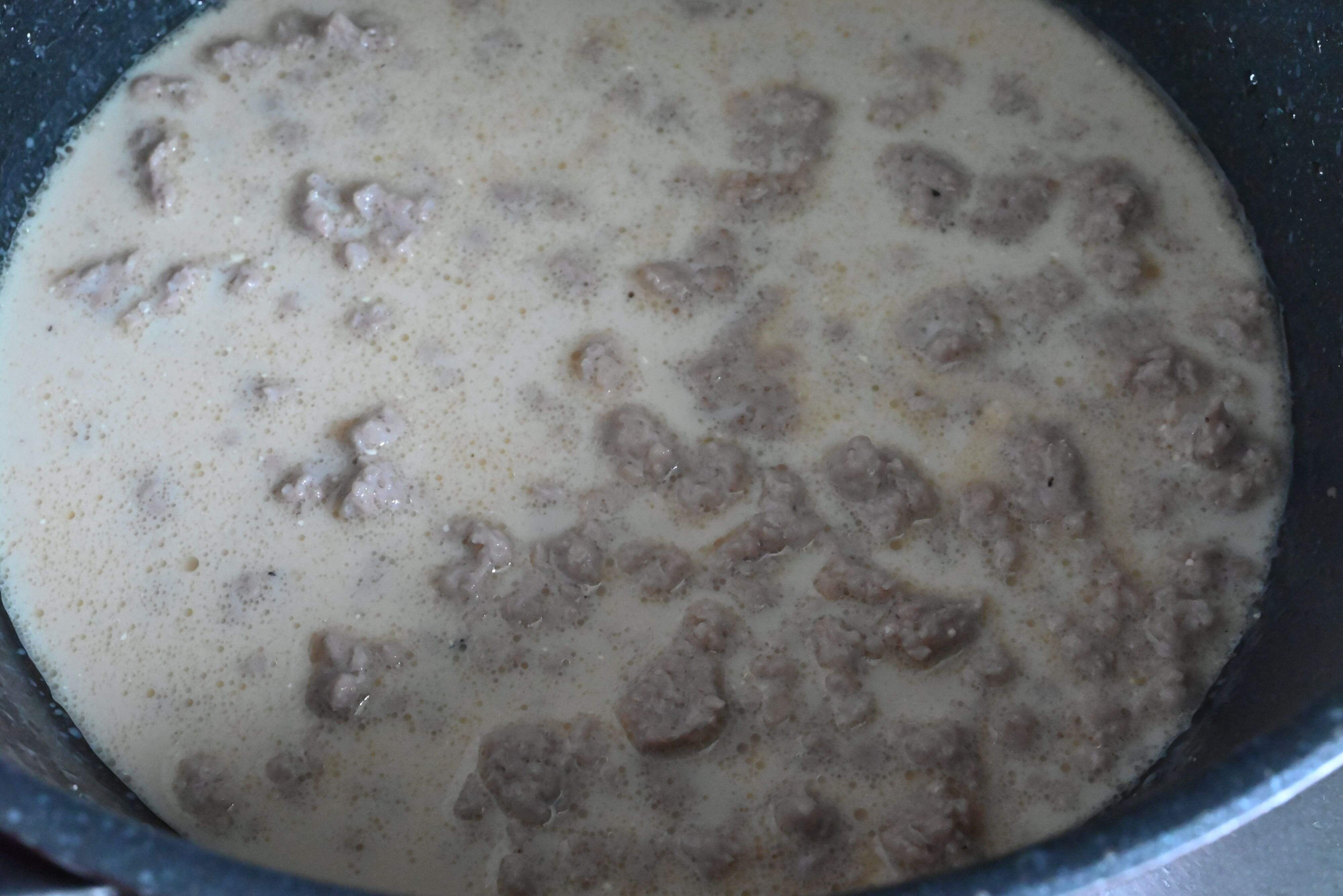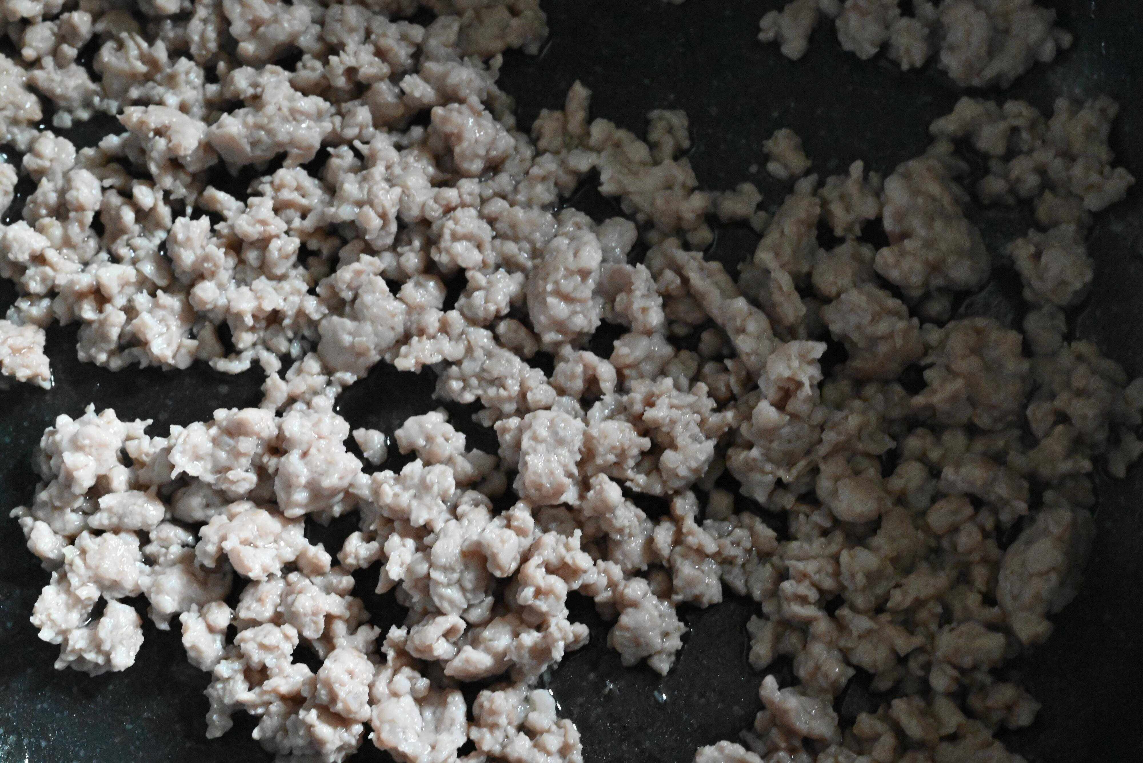 (3)フライパンにごま油を入れて中火にかけ、豚ひき肉を炒める。