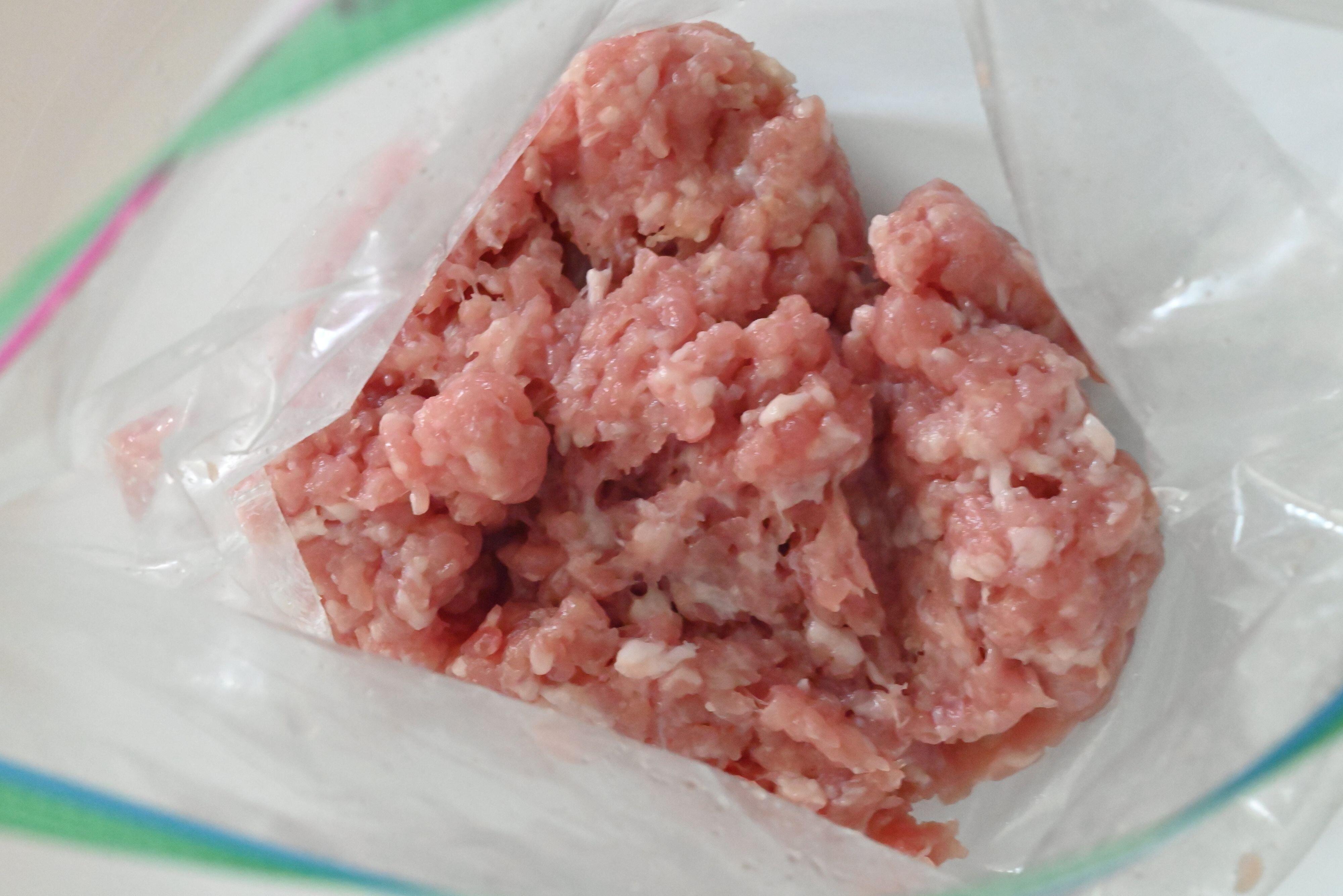 (1)豚ひき肉に、にんにくチューブ、しょうがチューブ、酒を揉みこむ。