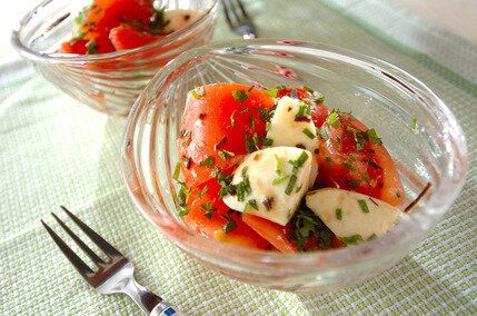 薄切りにしたトマトとモッツァレラチーズを並べるイメージのあるカプレーゼを、ゴロゴロとしたカットで和風にアレンジ!