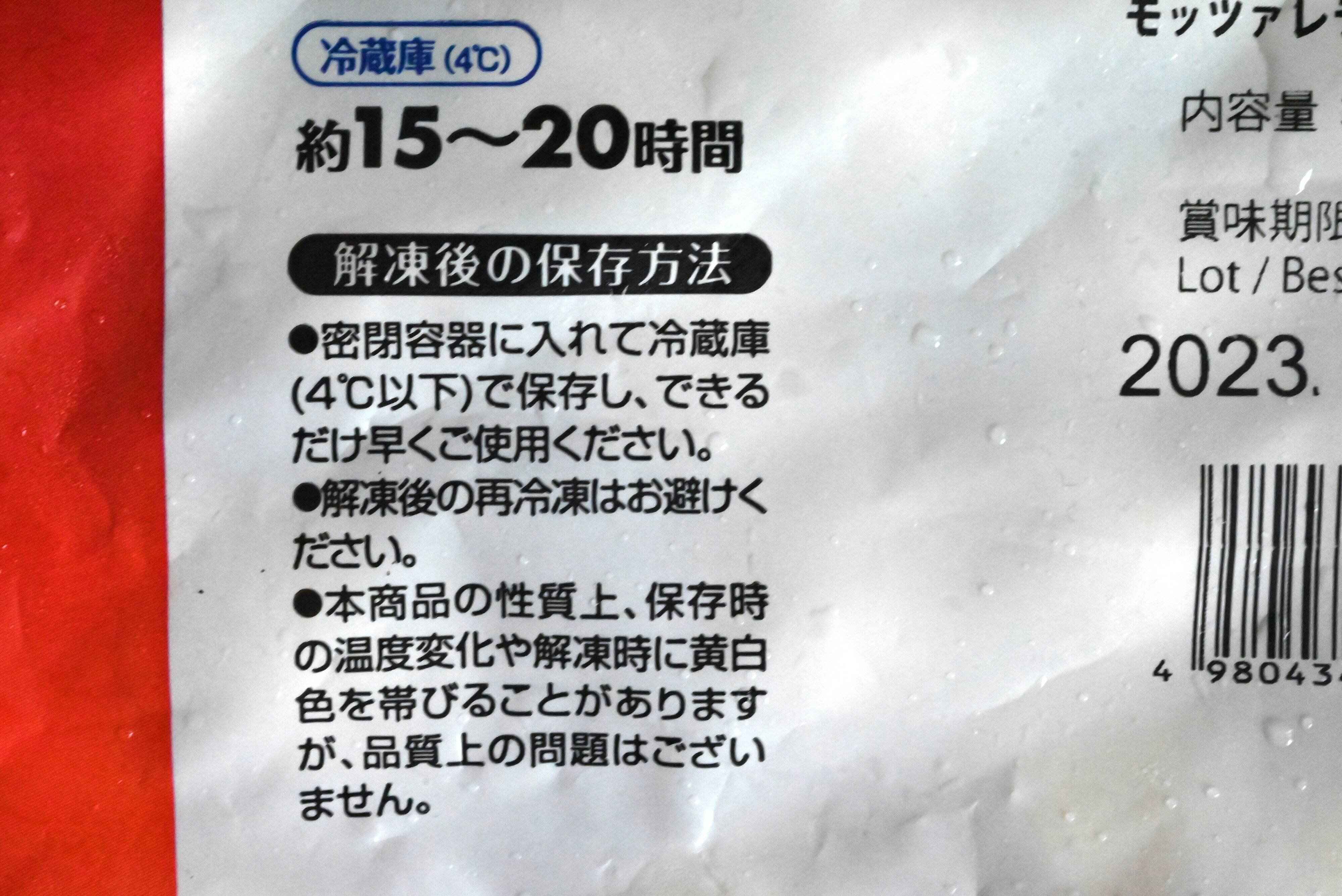 一般的なモッツァレラチーズは、1ヵ月前後しか日持ちがしません。しかし、この商品の賞味期限は冷凍保存で購入日からおよそ1年あるので、無理なく使いきれますよ。