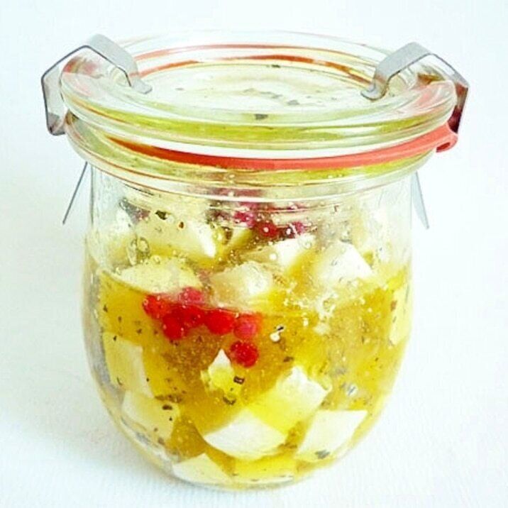 (1)清潔な保存容器にモッツァレラチーズを入れ、ひたひたになる高さまでめんつゆを入れる。