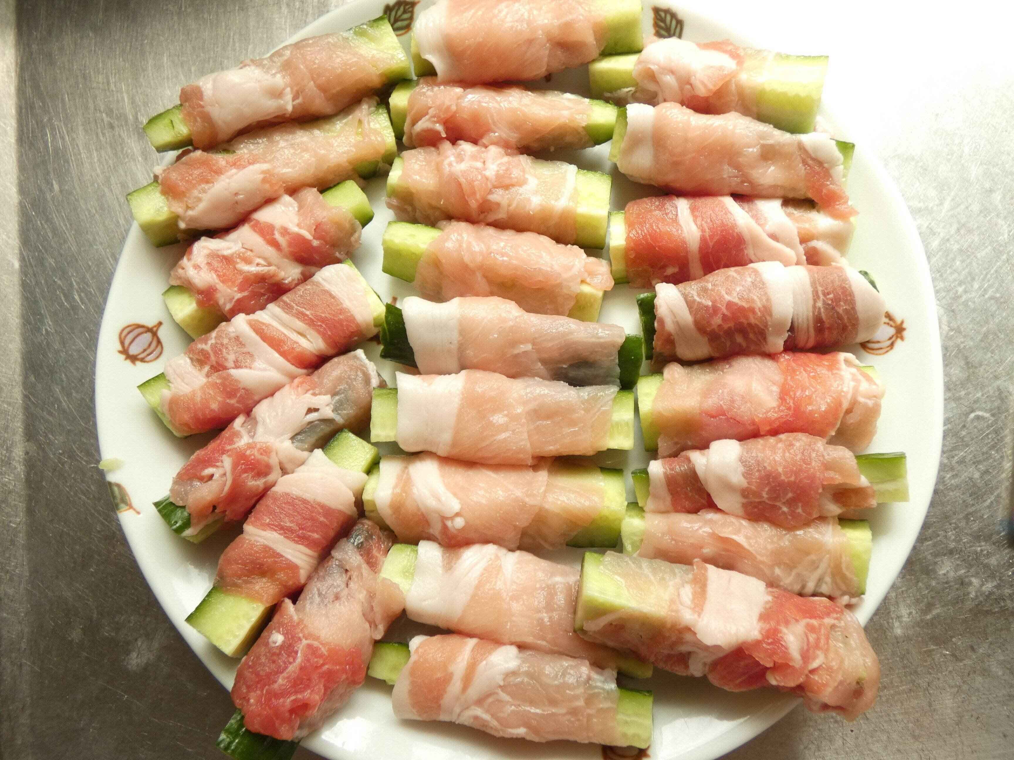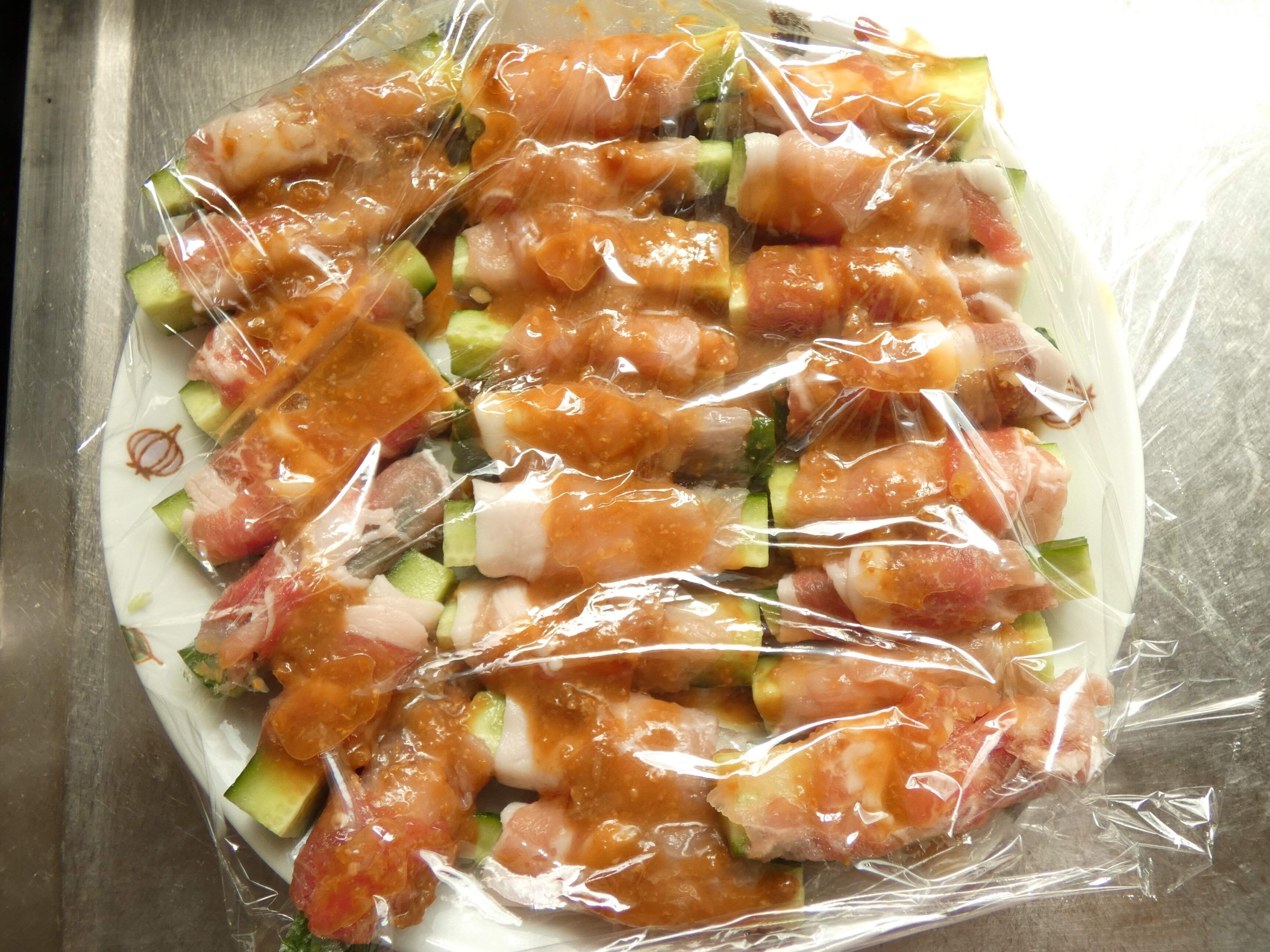 2.豚肉は長さを半分に切り、キュウリを巻いて耐熱皿に並べます。