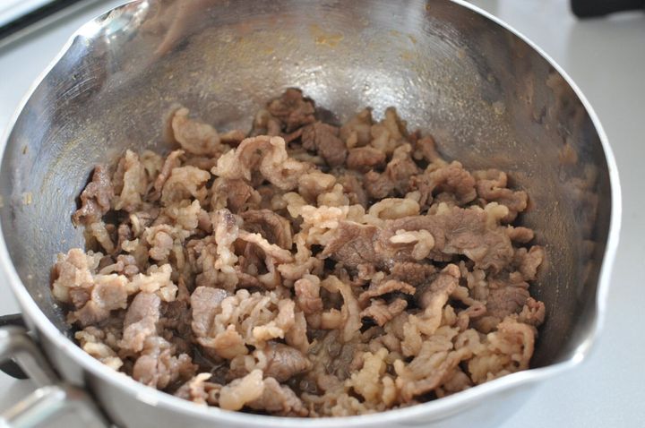 煮立ったら、食べやすい大きさに切った牛肉を加えて、2~3分やや強火で煮ます。