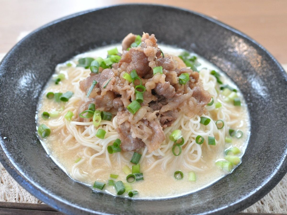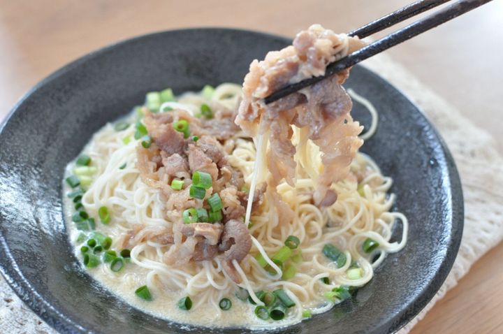見た目は白い汁であっさり味を想像しますが、出汁の効いたしっかり味でボリューミーな一皿に仕上がります。牛肉を煮る工程も含めて、10分以内でつくれますよ。ぜひ夏休みのお昼ごはんにつくってみてください。