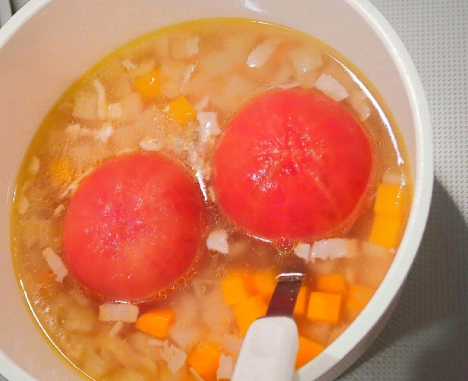 つづいて湯むきしたトマトを、くり抜いた面が下向きになるように入れます。再びふたをして弱火で約5分煮ます。にんじんがやわらかくなったら塩、こしょうで味を調えます。味が濃い場合は少量の水を加えて調節します。