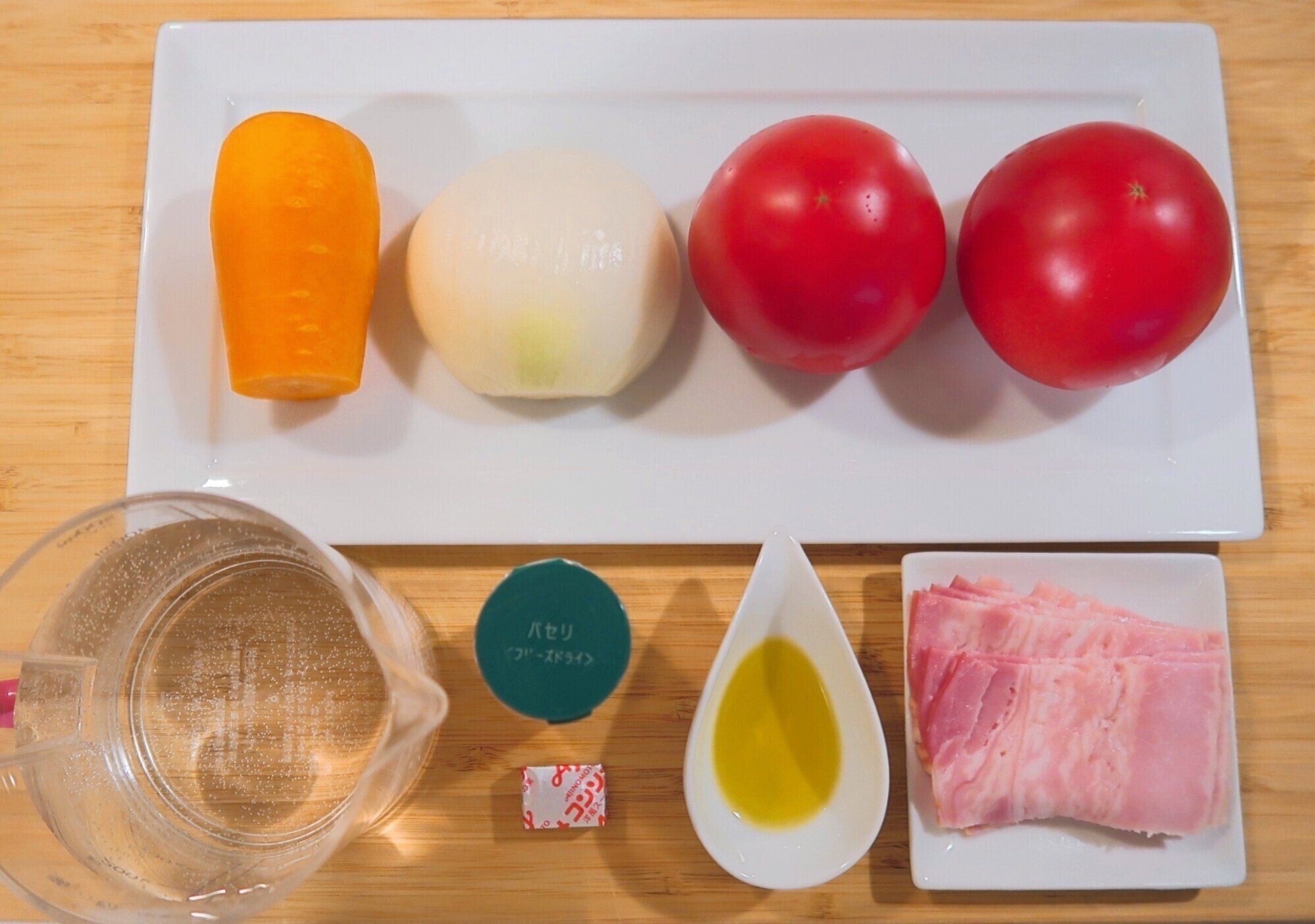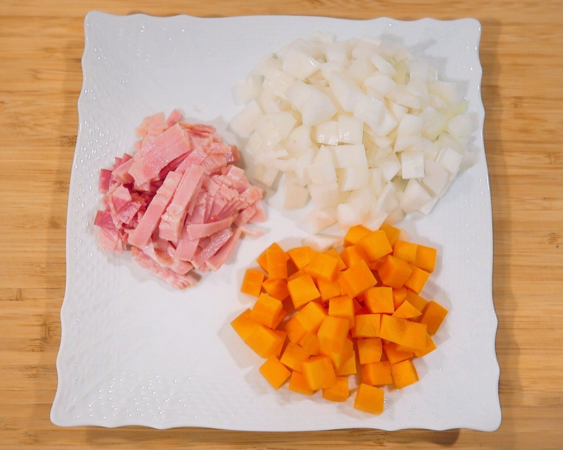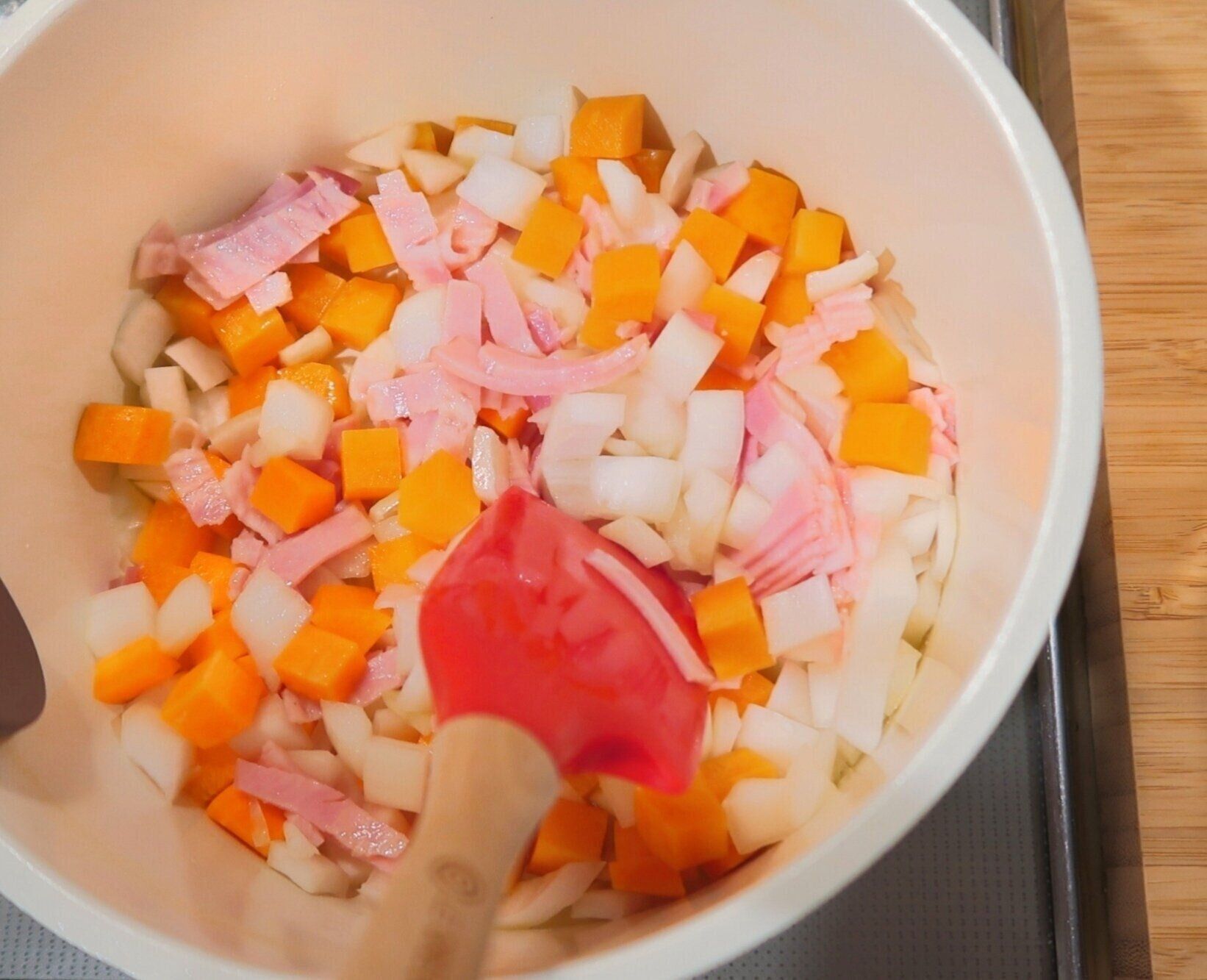 玉ねぎ、にんじんは約1cmの角切りにします。ベーコンは約5mm幅の細切りにします。