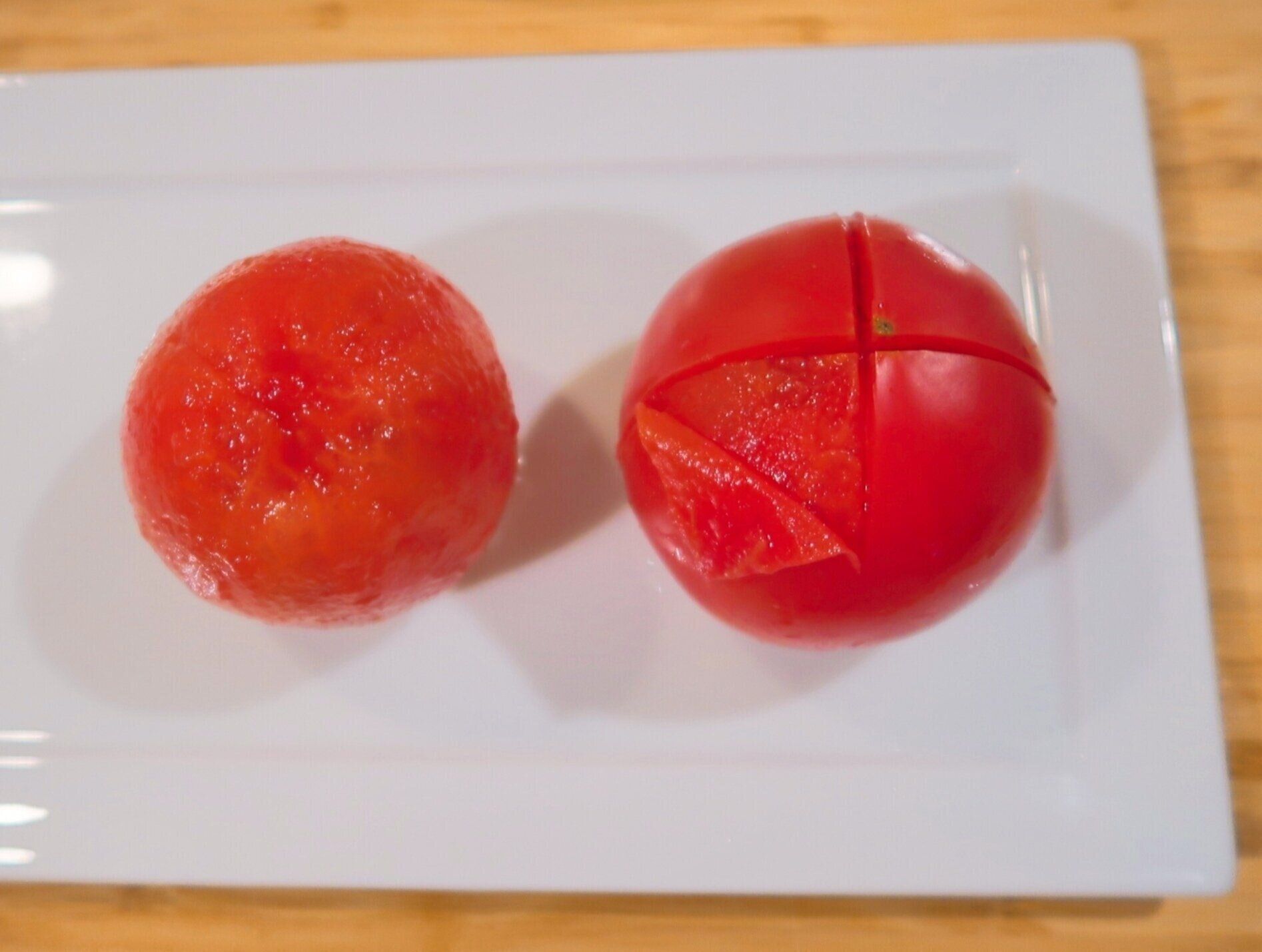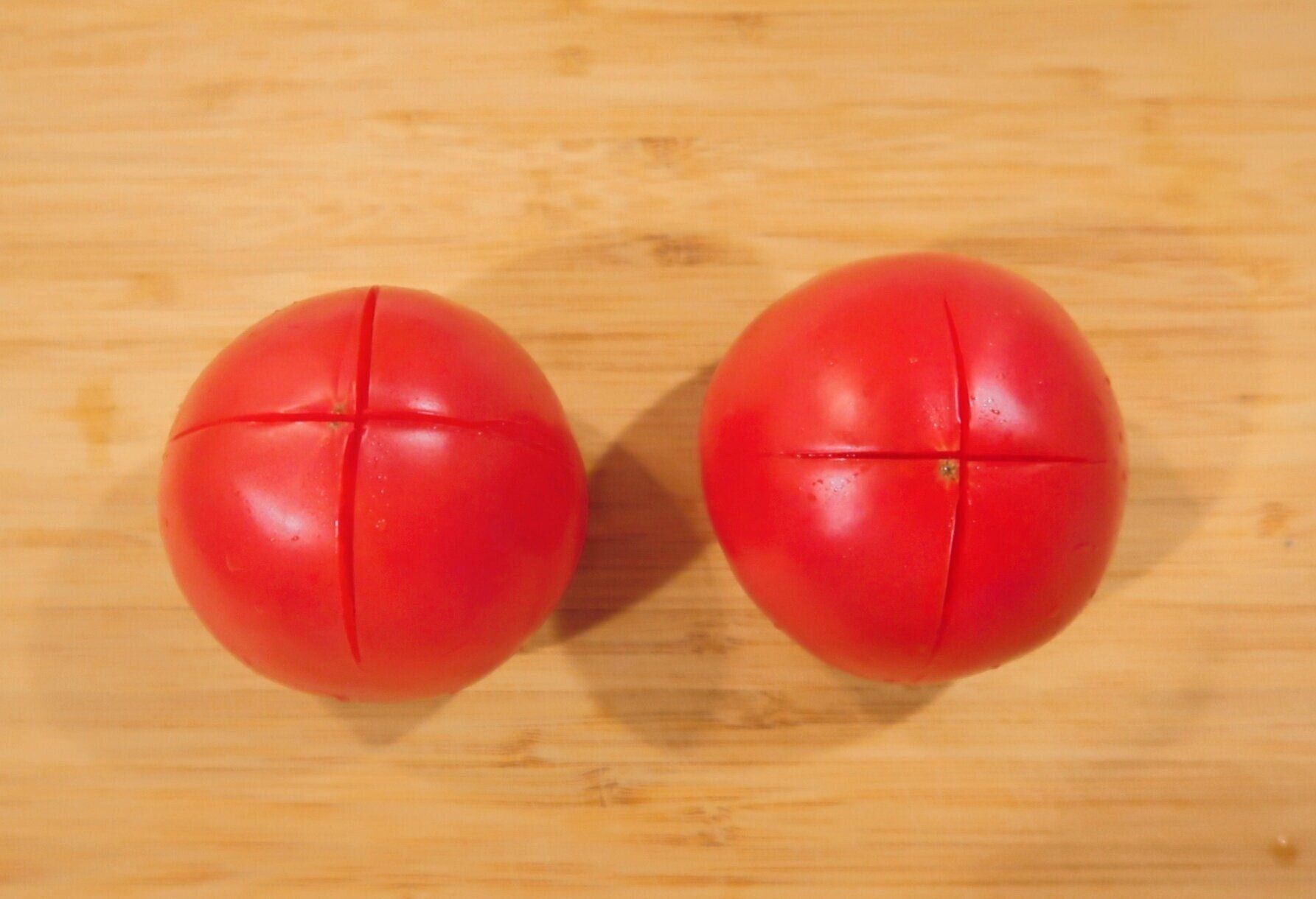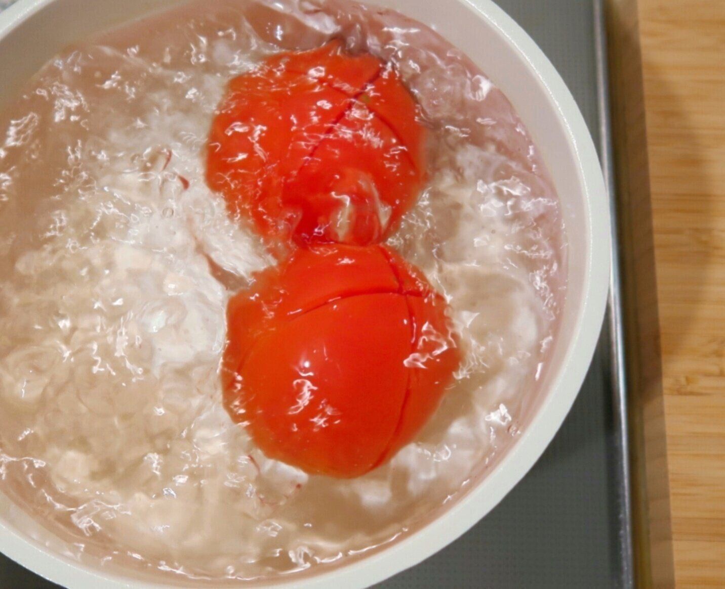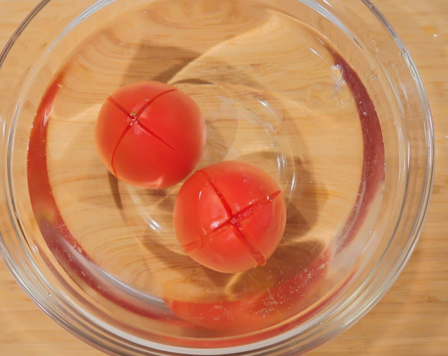 沸騰したお湯にトマトを入れ、約30秒ゆでます。