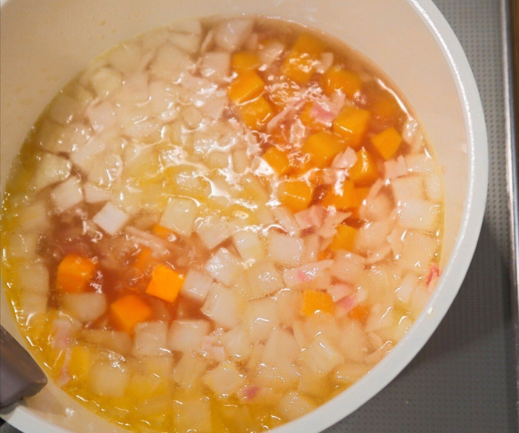 玉ねぎが透き通ったら水(400ml)、コンソメキューブを加えます。一度沸騰させてアクをとり、ふたをして弱火で約10分煮ます。