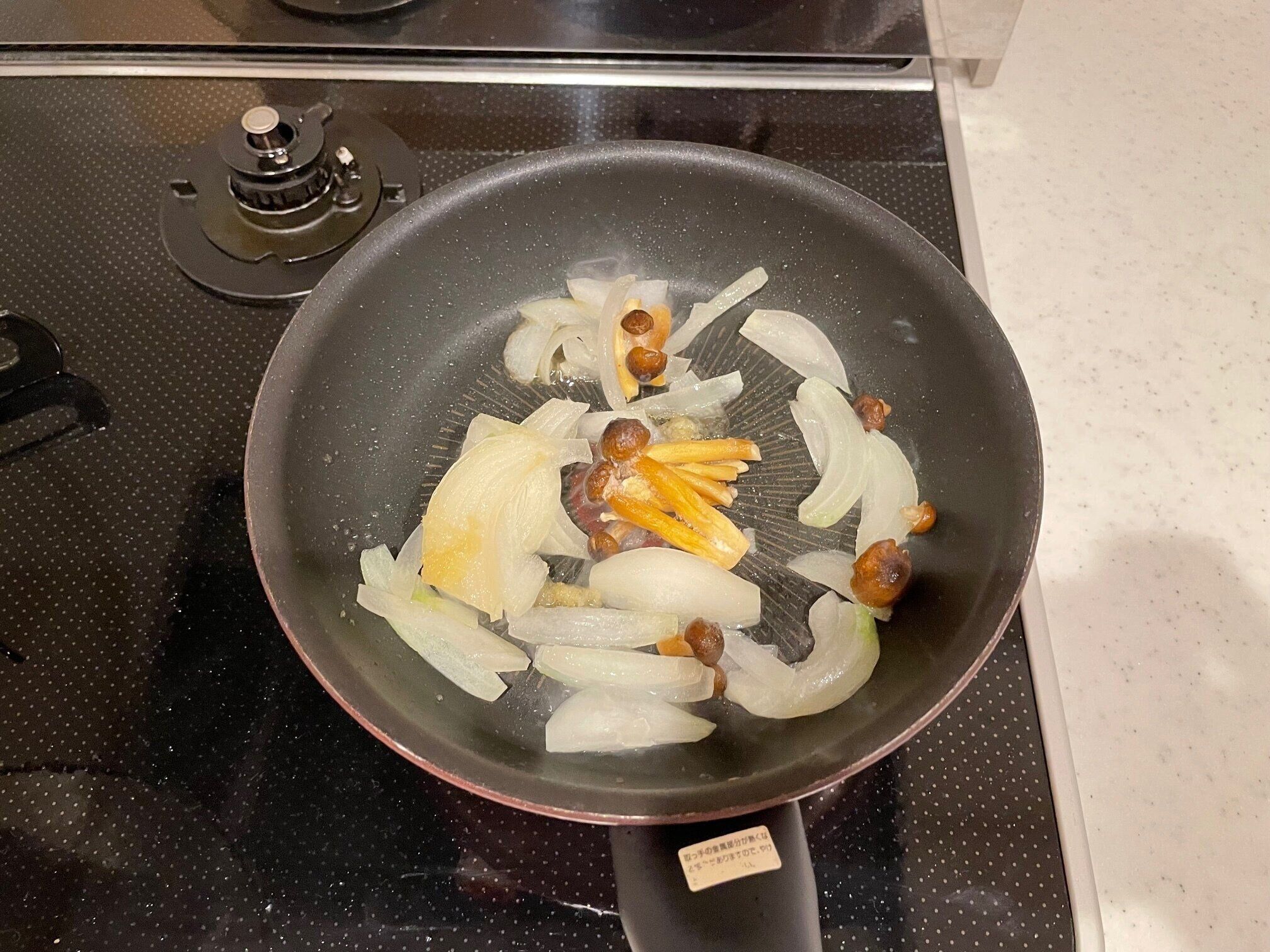 (2) (1)にお好みのサイズにカットした玉ねぎを入れて透明になるまで炒めます。