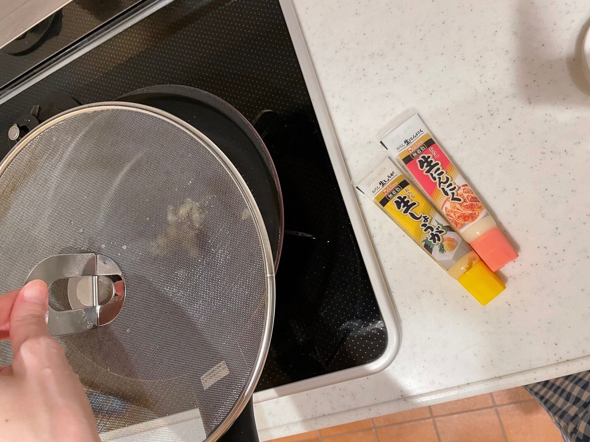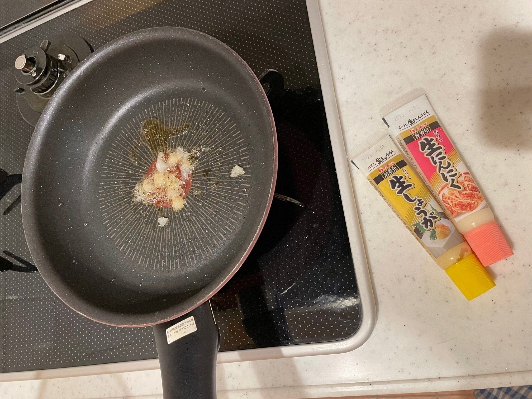 (1)熱したフライパンにごま油を入れて、にんにくと生姜のチューブを入れます。