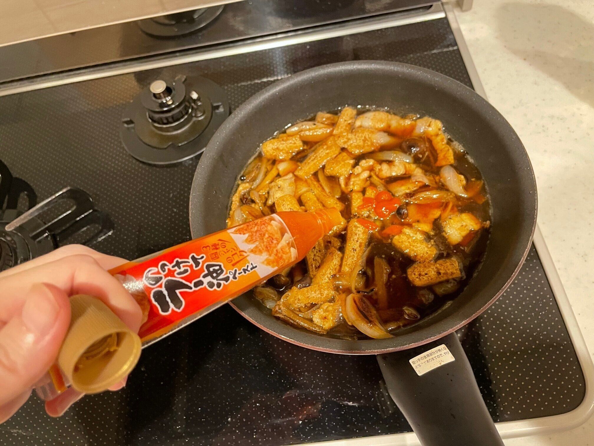 (3)豚バラを入れて、火が通ったら★印の調味料を入れます。さらにきざみ揚げを入れます。最後にラー油を少々入れます。沸騰したらつけダレの完成です。