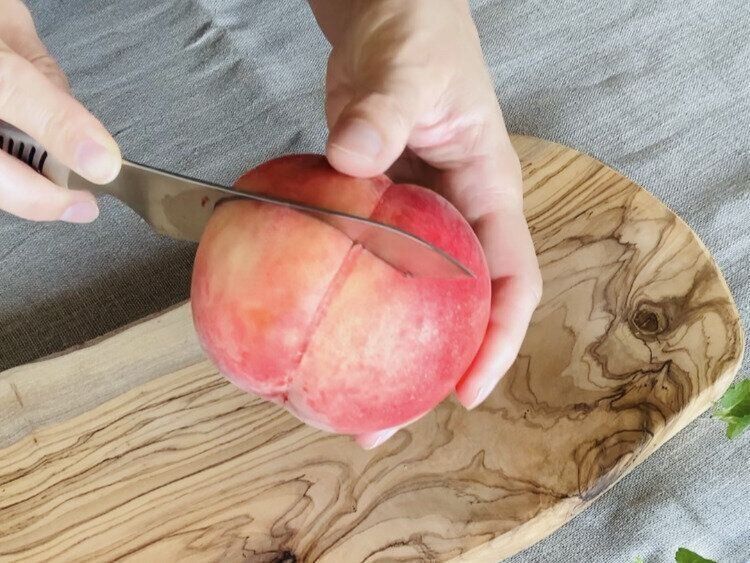 まずは、桃の線に沿ってぐるりと一周、種に向かって垂直に包丁を入れます。