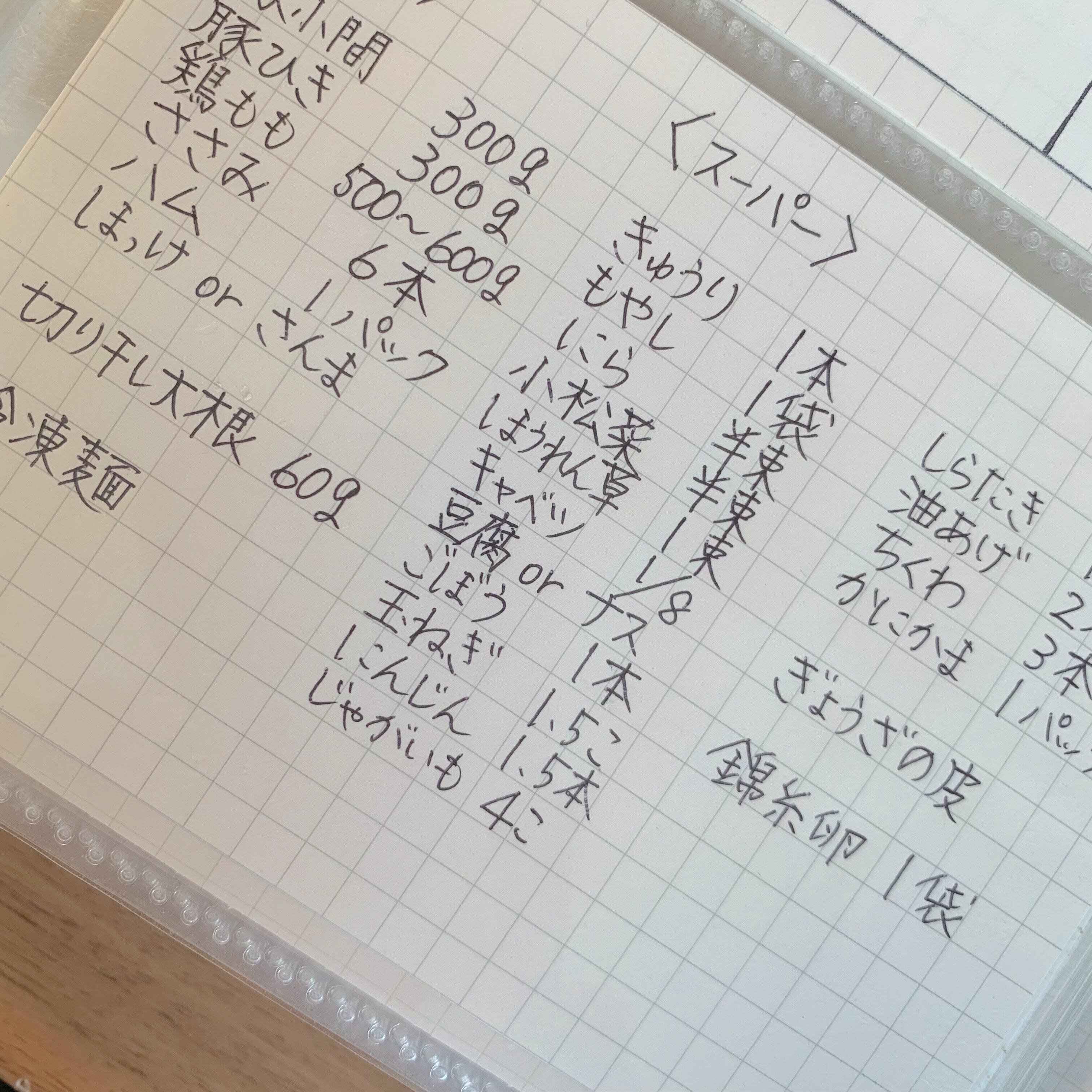 写真のように使う食材をリストアップしておけば、1週間分の買い物を短時間で済ませることができます。