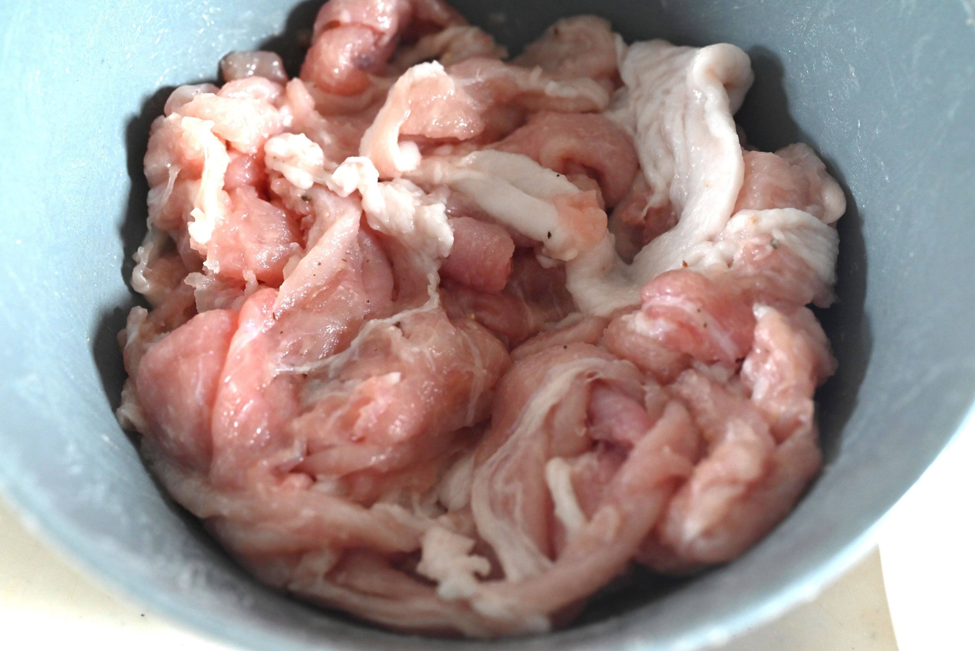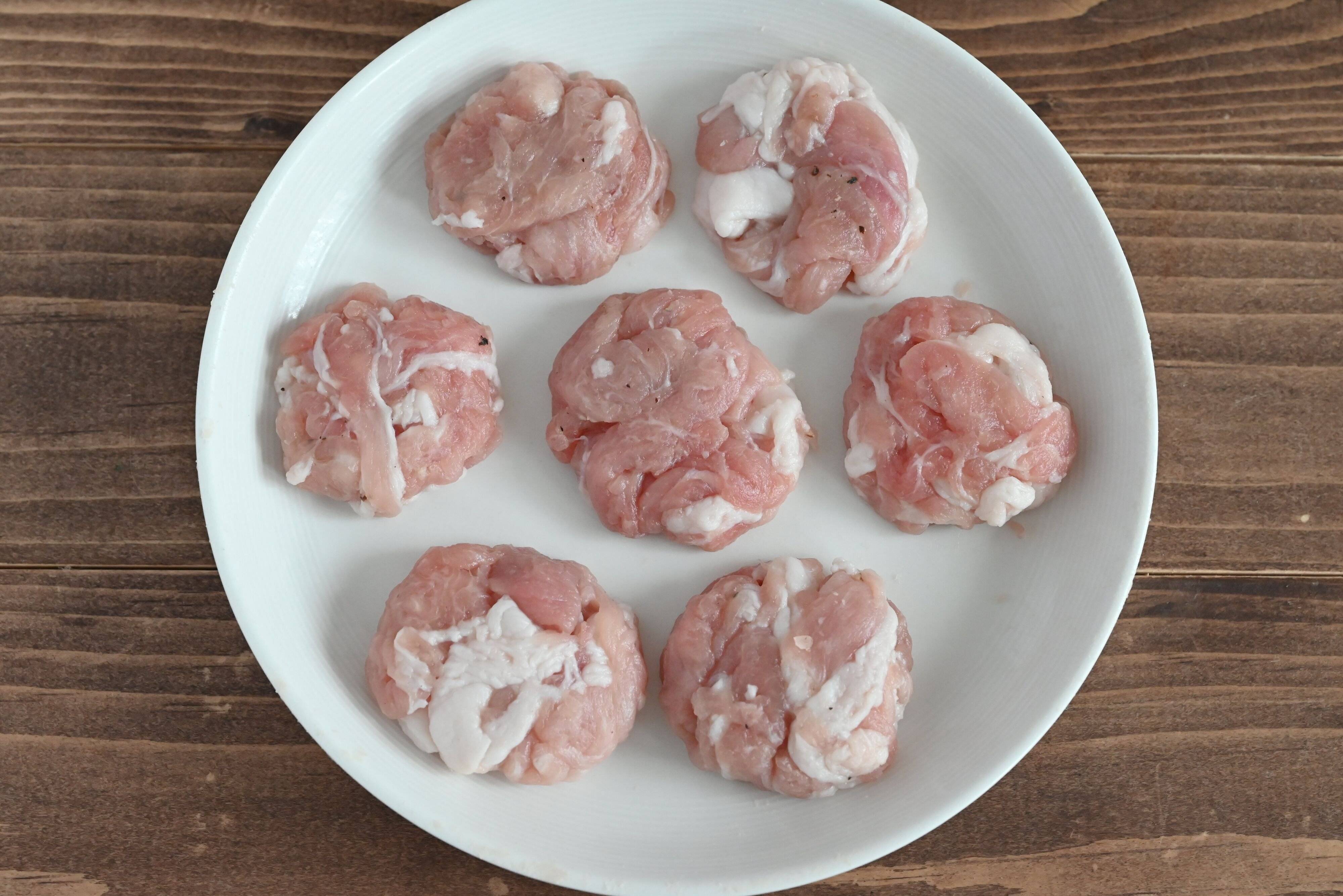 (1)豚こま切れ肉に塩・こしょう、片栗粉を合わせて揉み込む。