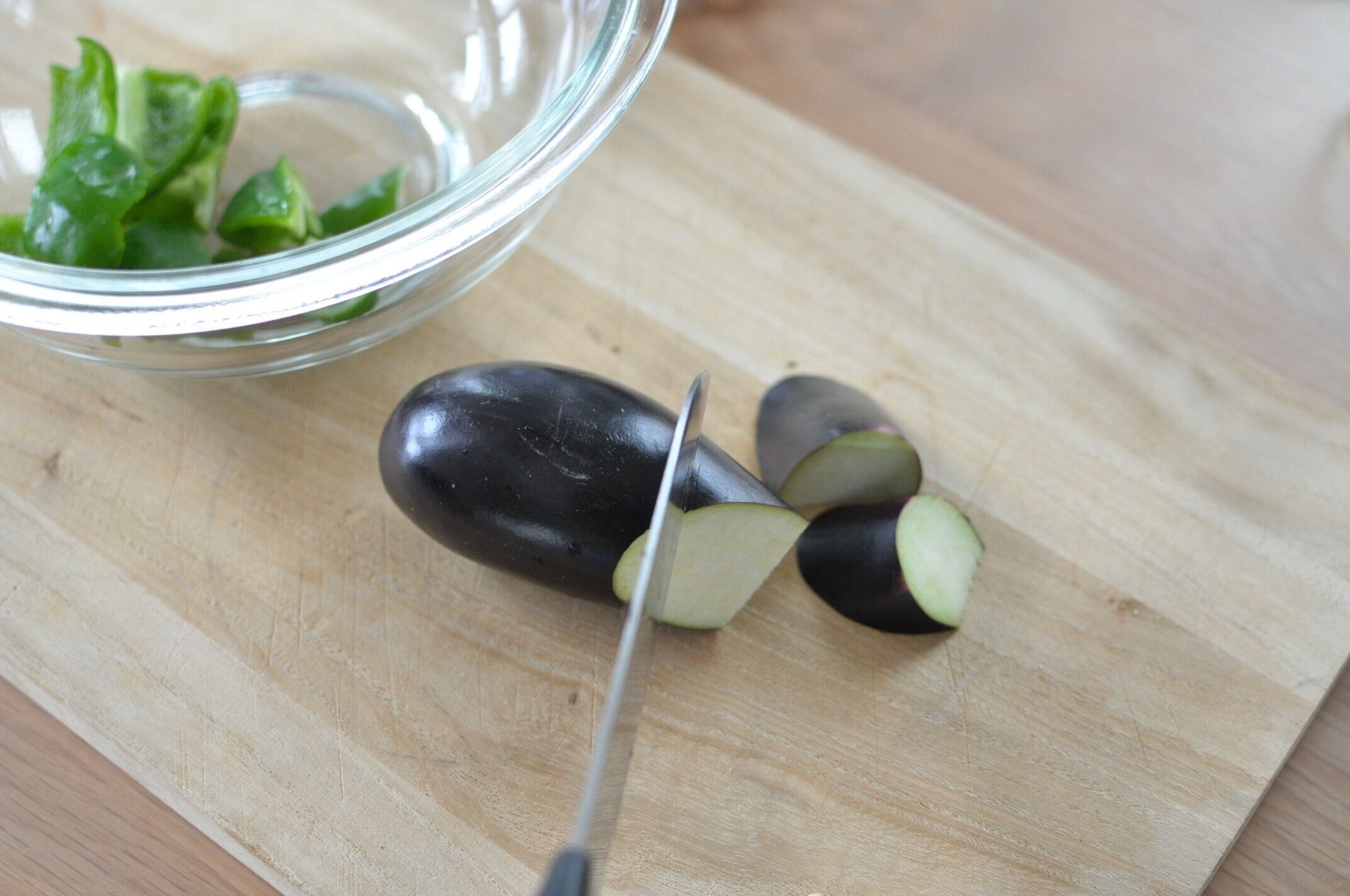 なすとピーマンをひと口大の乱切りにして、耐熱ボウルに入れます。