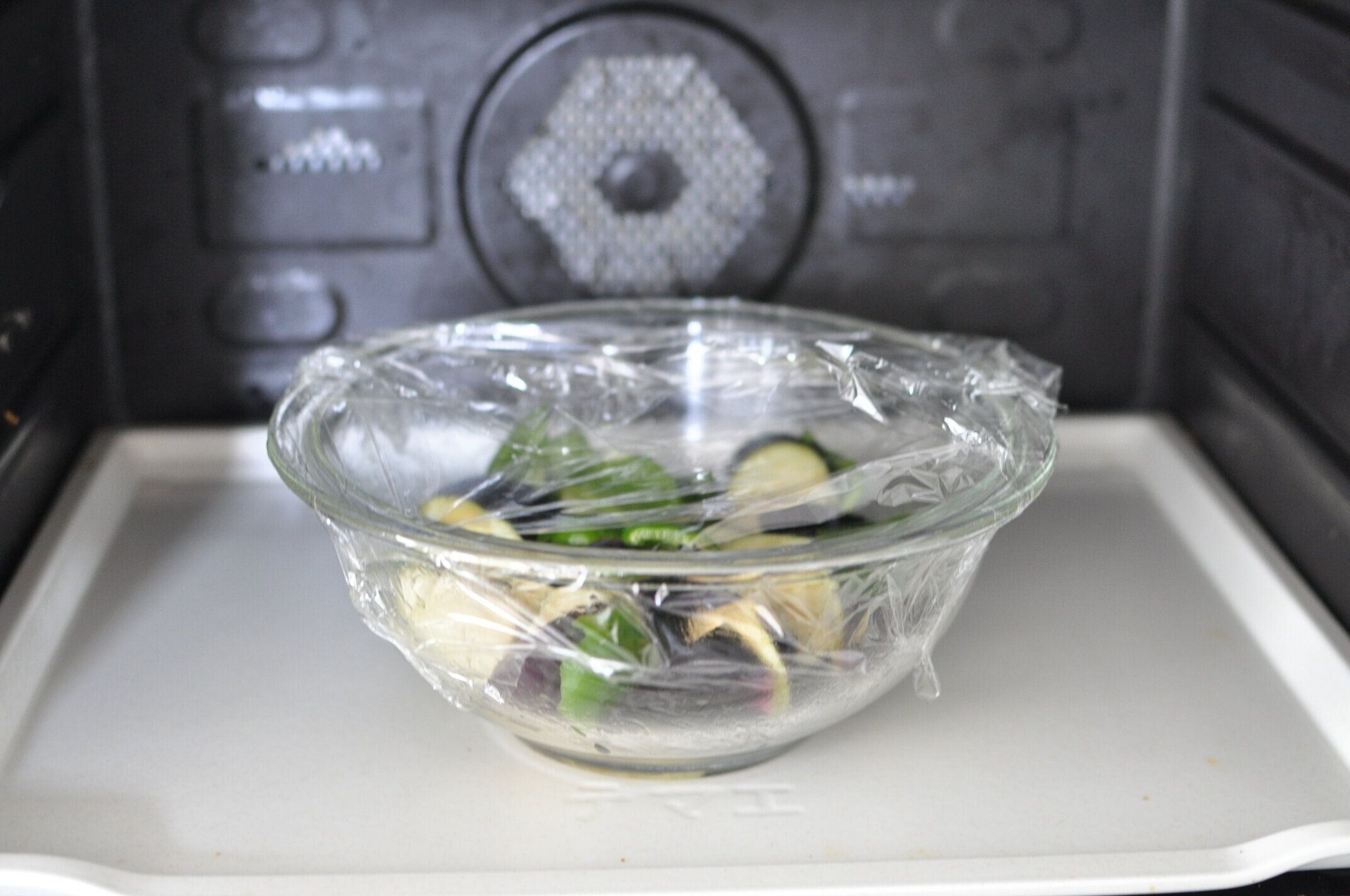 ふんわりラップをして、レンジ600Wで3分加熱します。