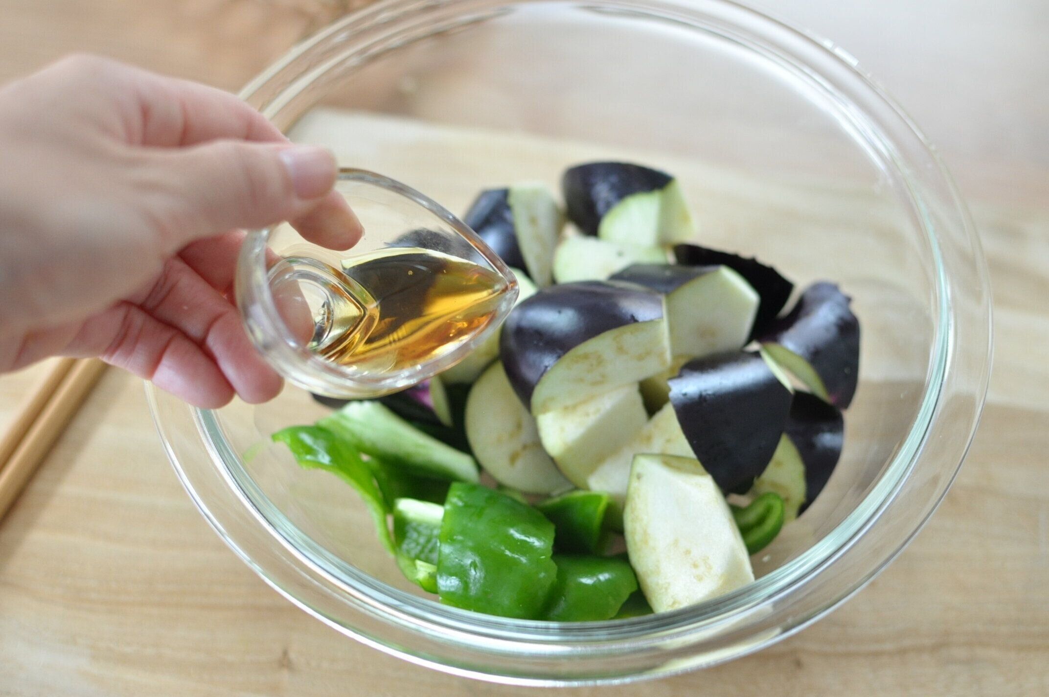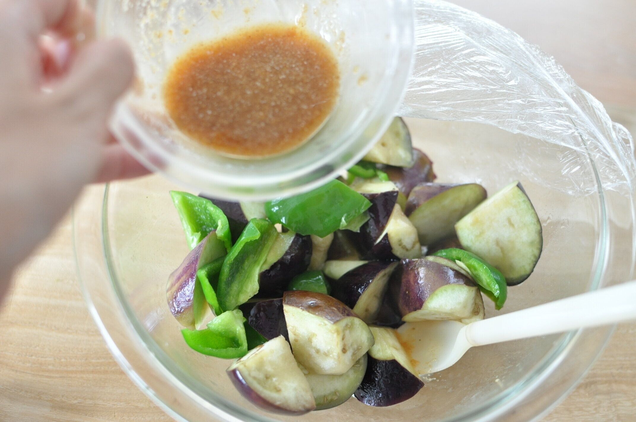 レンジからボウルを取り出します。調味料Aを混ぜ合わせ、なすとピーマンに加えます。