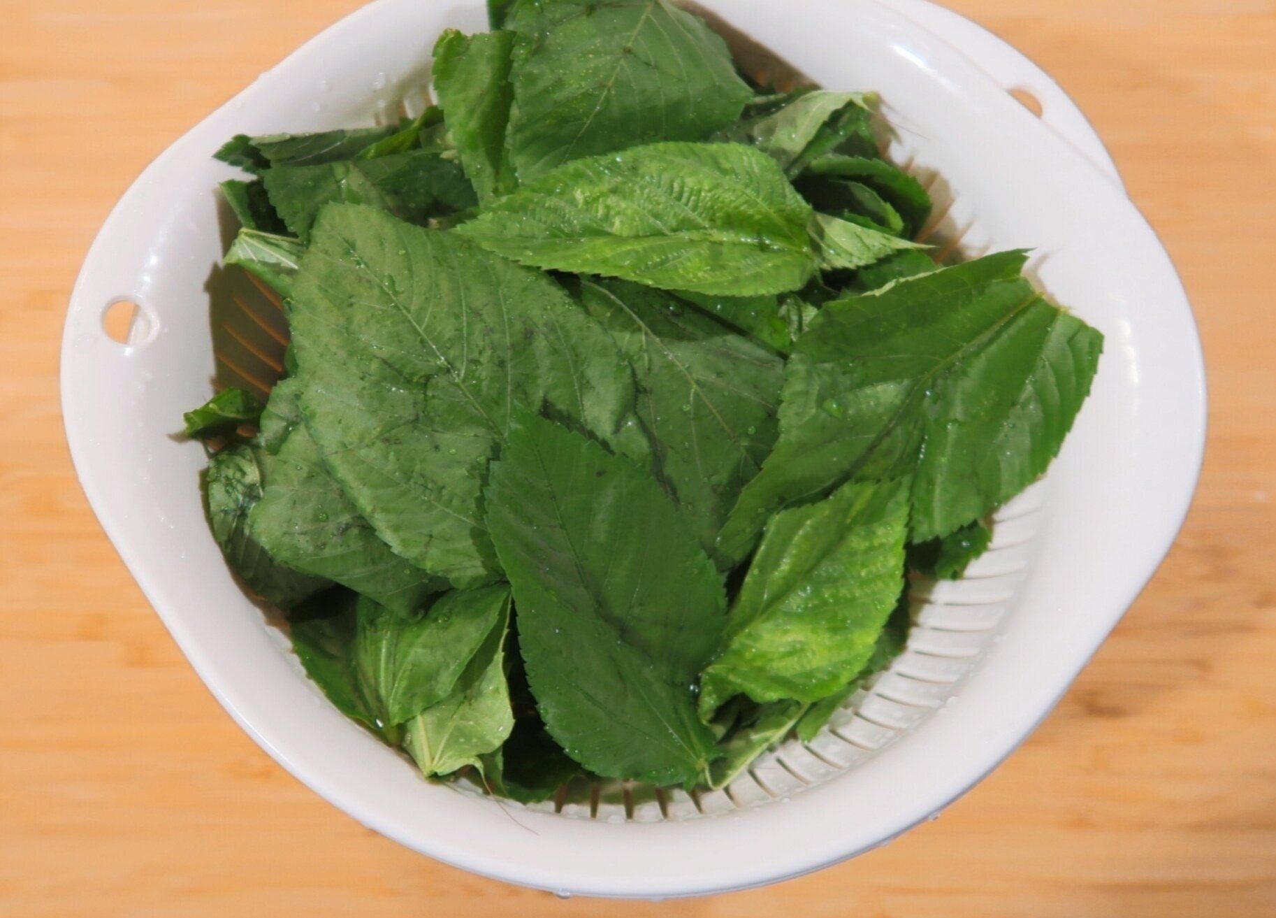 モロヘイヤは葉先を摘み、茎を取り除きます。