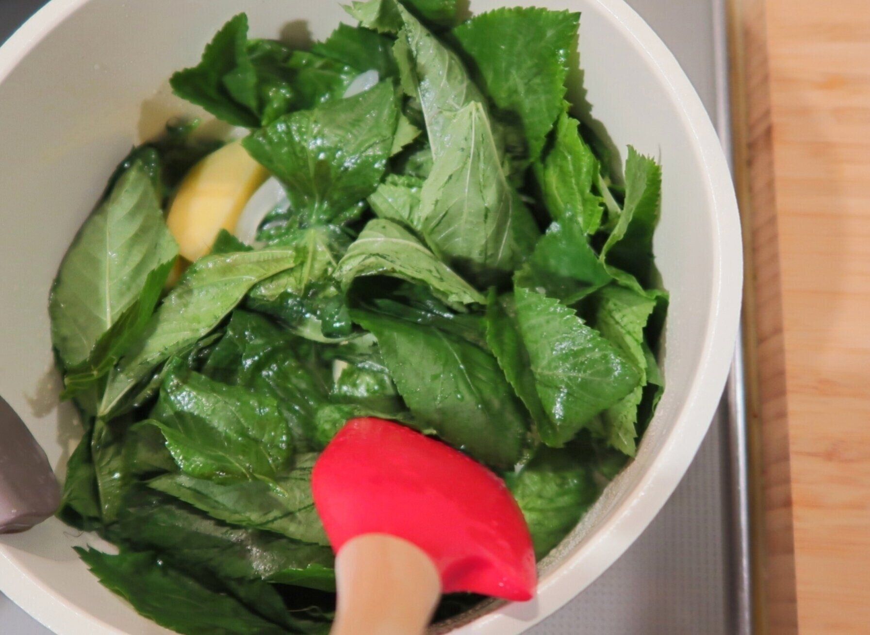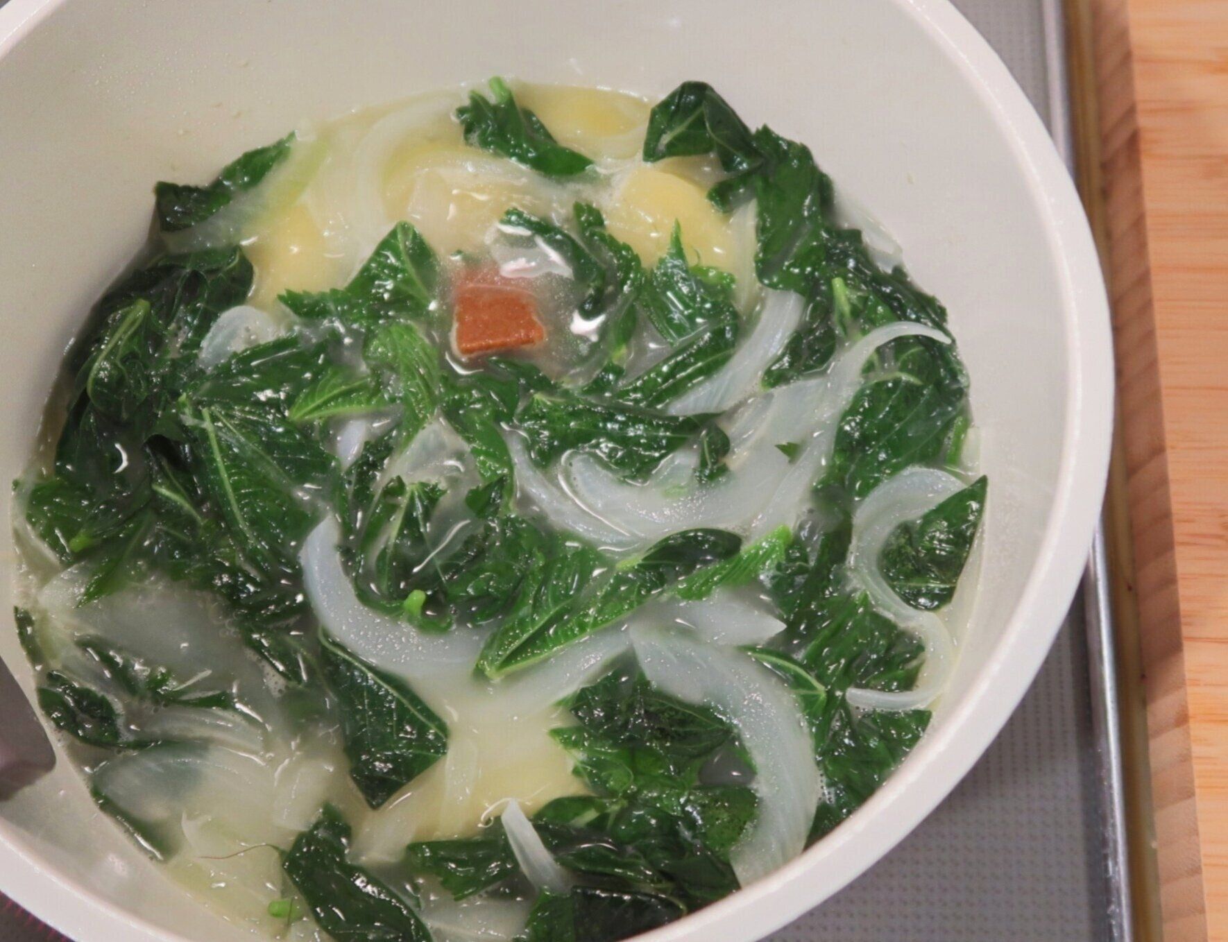 玉ねぎが透き通りしんなりしたら、じゃがいも、モロヘイヤの葉を加え中火で約3分炒めます。