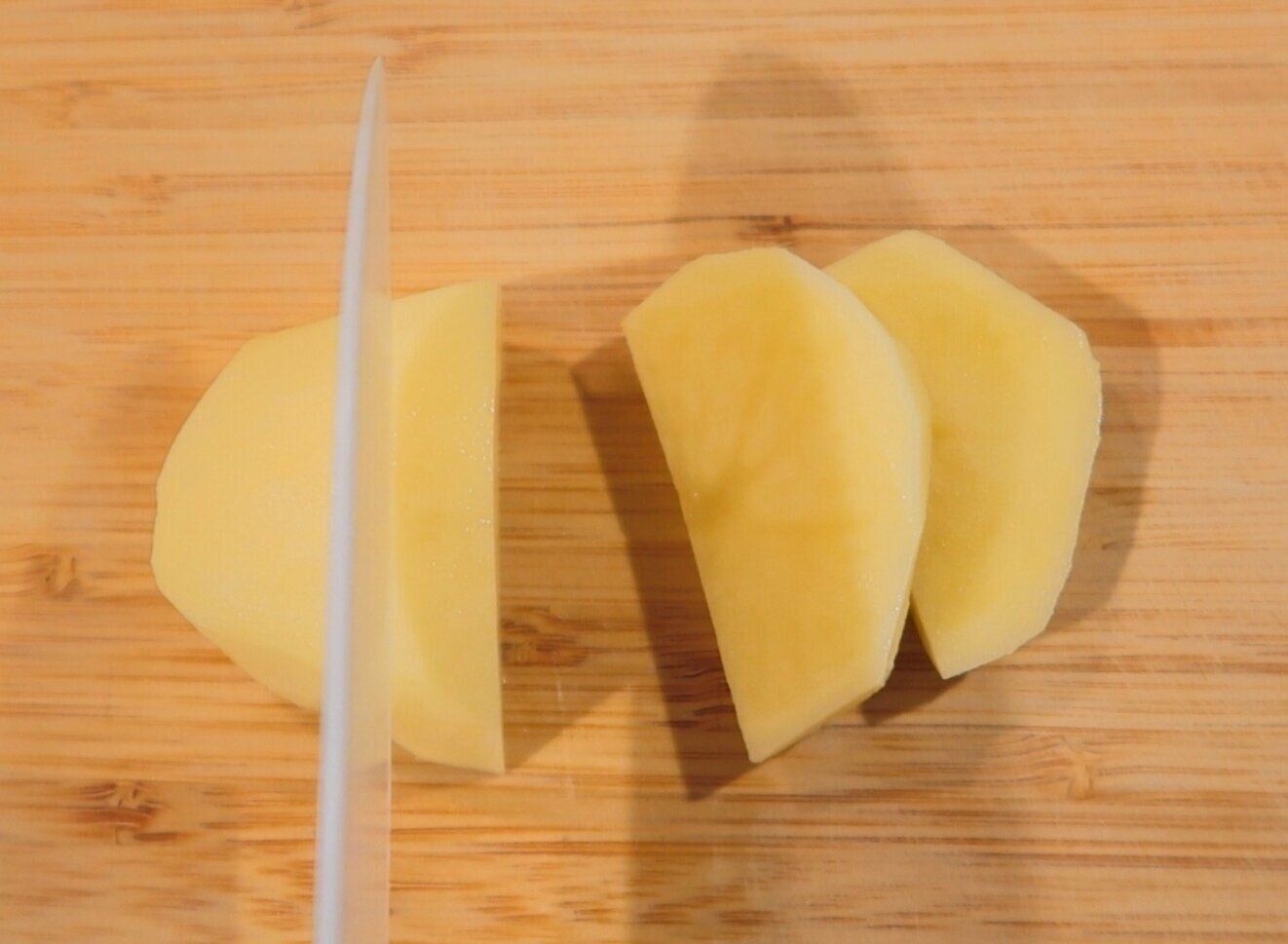 じゃがいもは皮をむき、たて半分に切ります。つづいて切り口を下に向け、約1cm幅にカットします。
