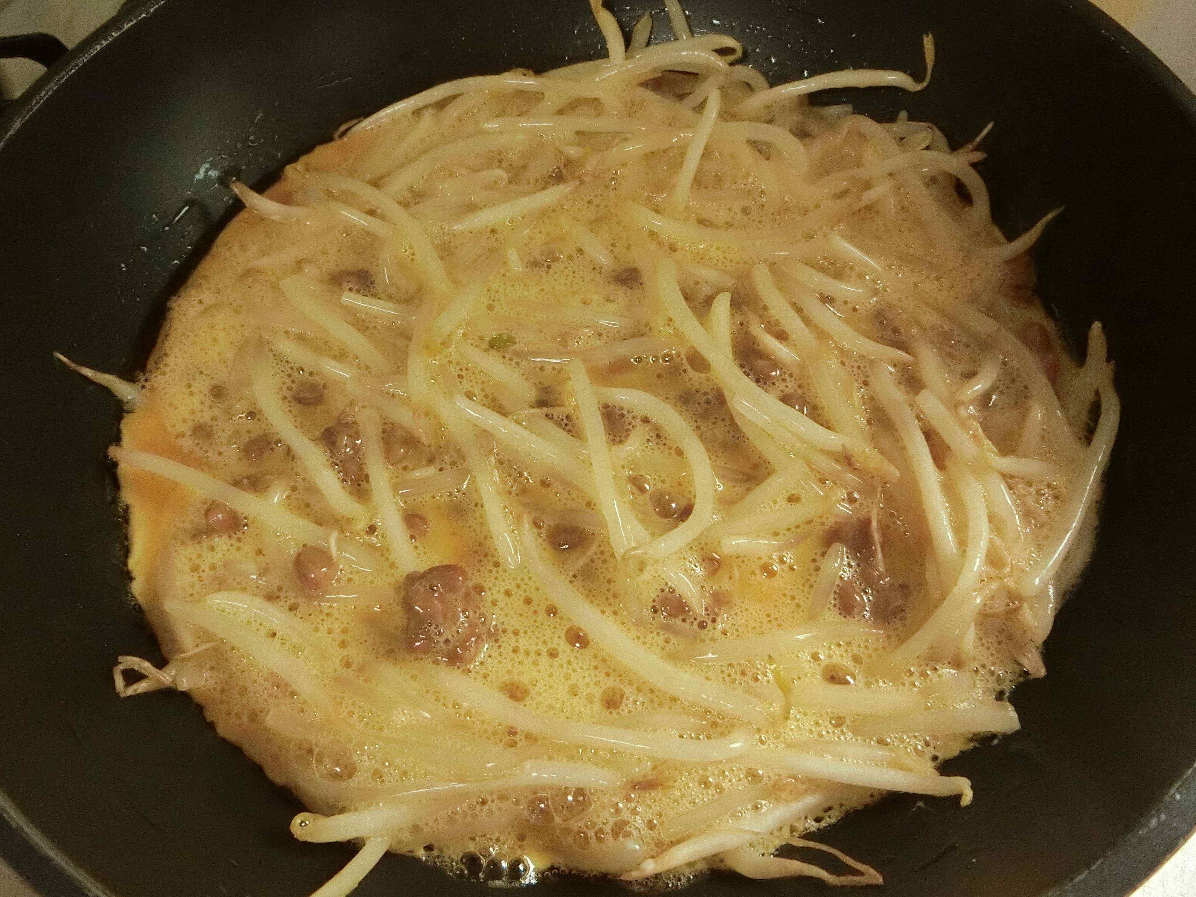 1.納豆をボウルに入れて軽く混ぜ合わせてほぐします。卵を割って混ぜたら、もやしを合わせます。