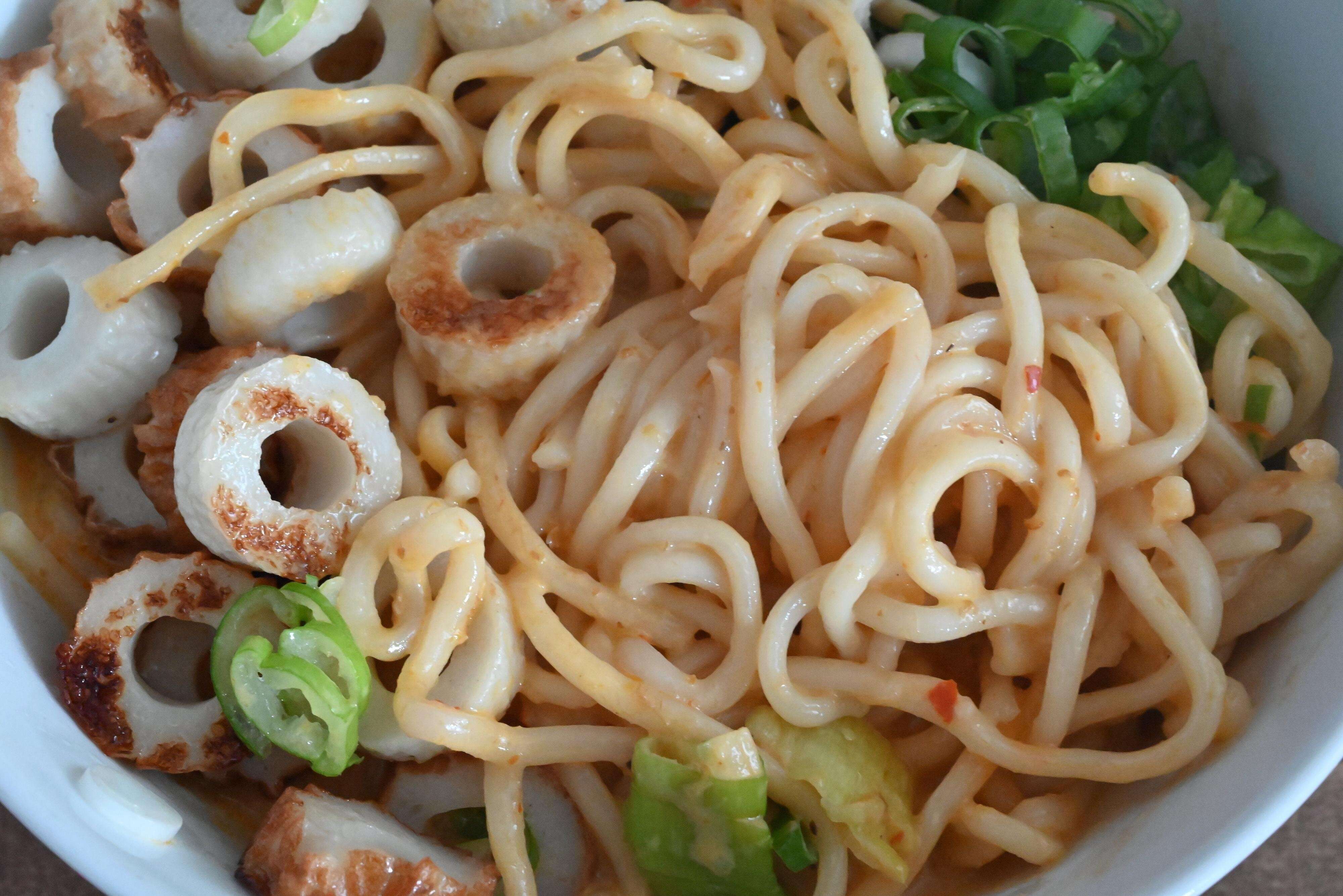 太めの麺に、濃厚な海老ベースのココナッツミルクスープがからむ絶品ラーメン!