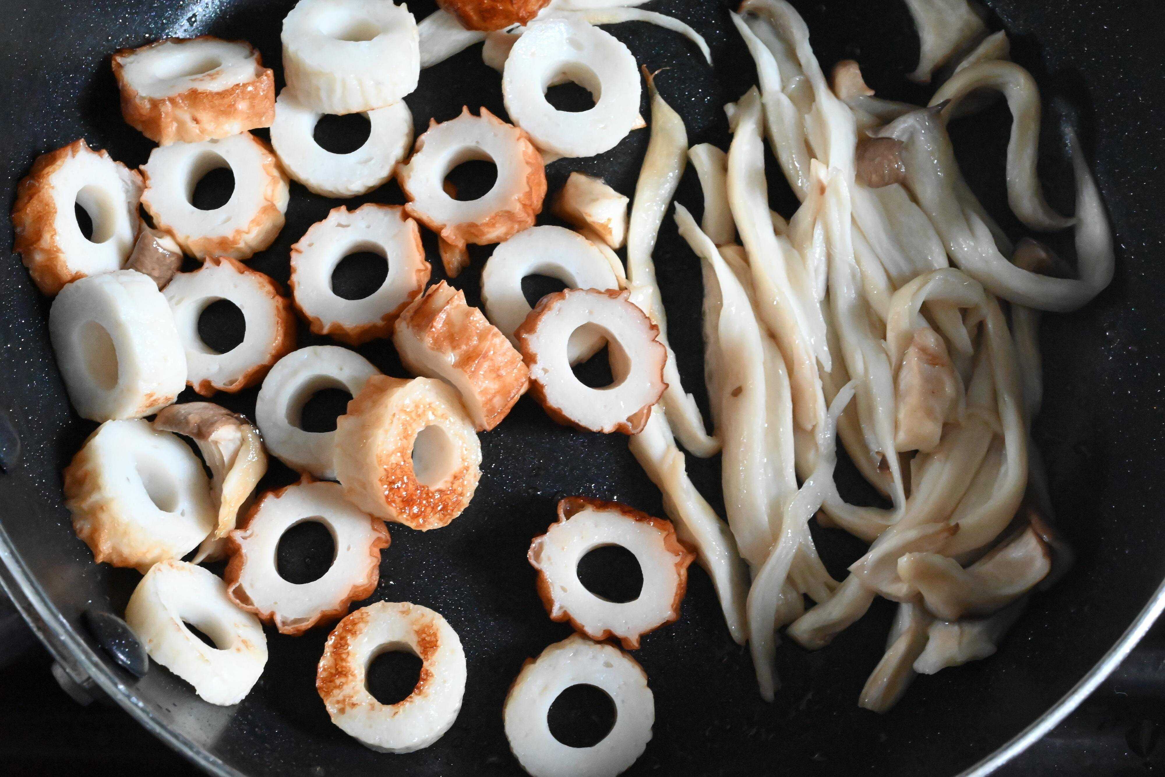 (4)フライパンにちくわとエリンギを入れ、ちくわにうっすら焼き色がつくまで炒める。