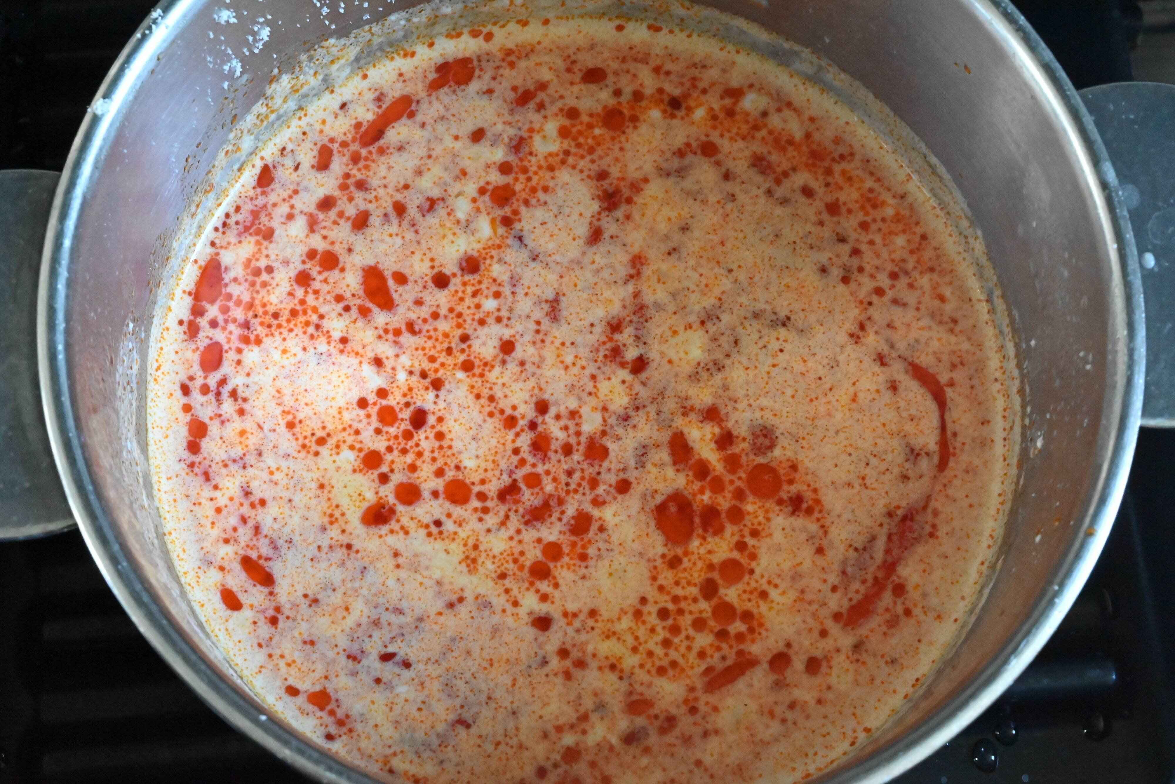 (2)麺を入れてときどき混ぜながら7分加熱する。