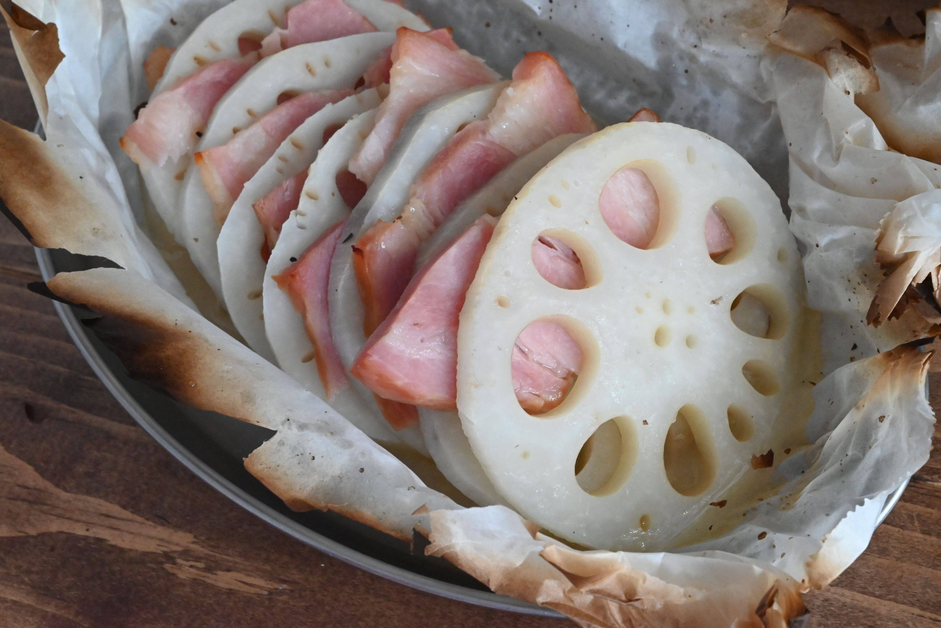 れんこんをクッキングシートで包んで蒸し焼きにするレシピです。