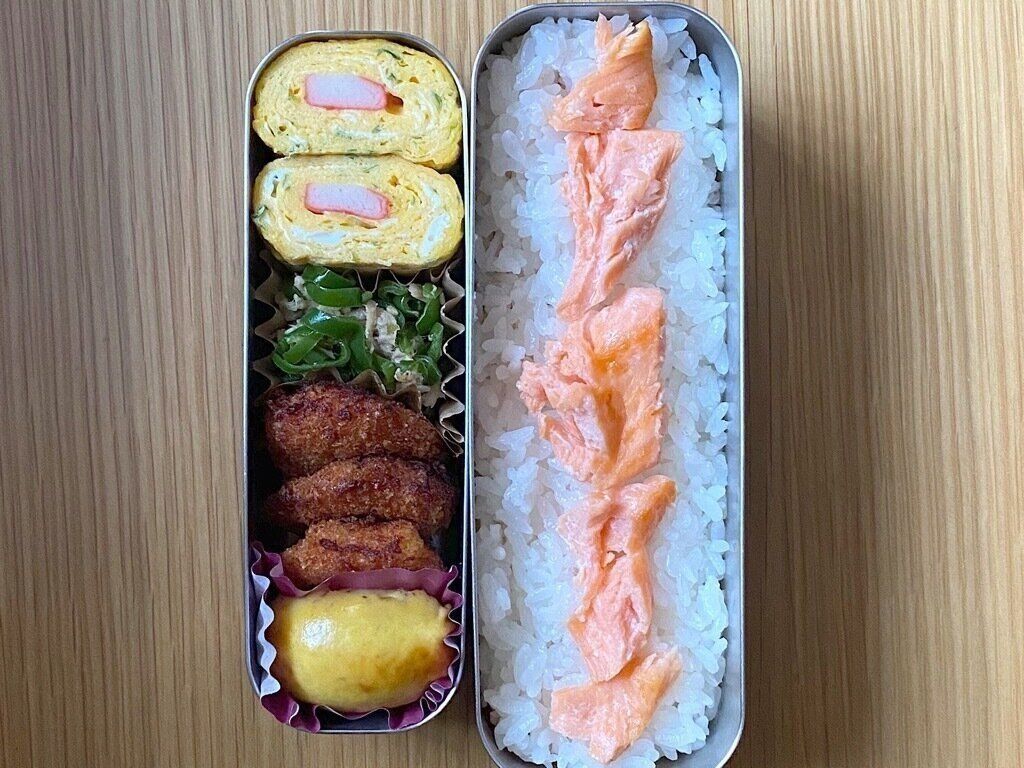 副菜は無限ピーマン、カニカマ入り卵焼き、冷凍食品のスイートポテト。ご飯の上には焼き鮭をのせました。