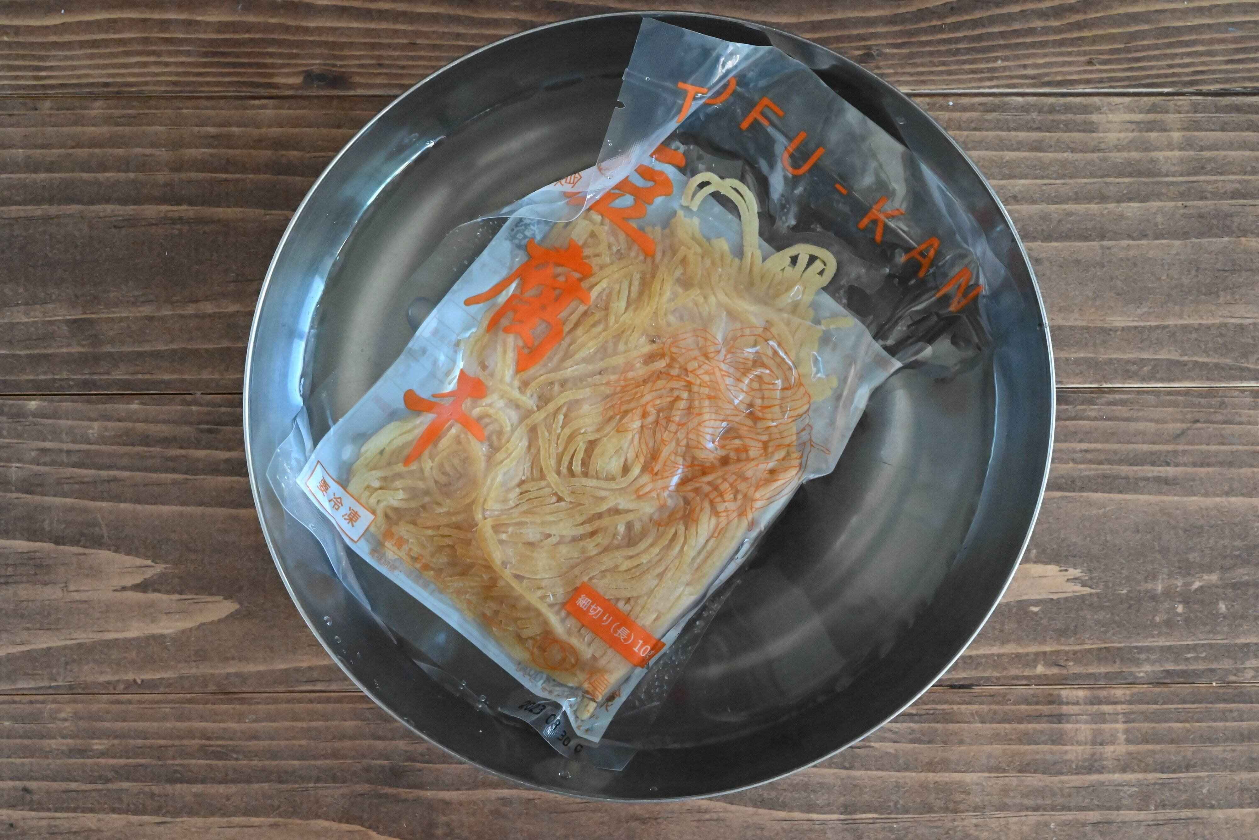 カルディの豆腐干は冷凍コーナーで販売されていて、冷蔵庫に入れる、もしくは水を入れたボウルに入れて解凍してから使います。