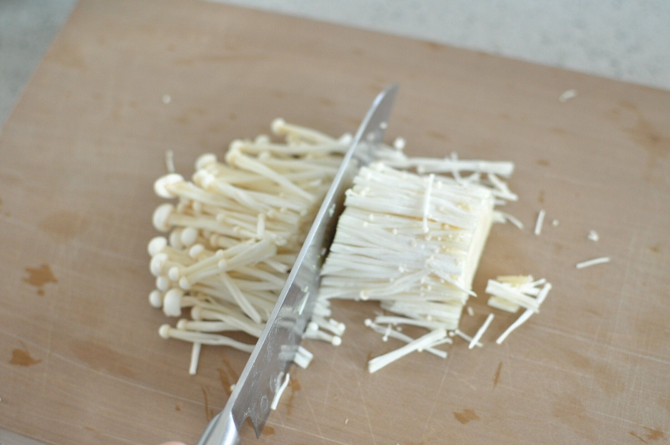 えのきは軸を切り落とし、半分にザクっと切ります。