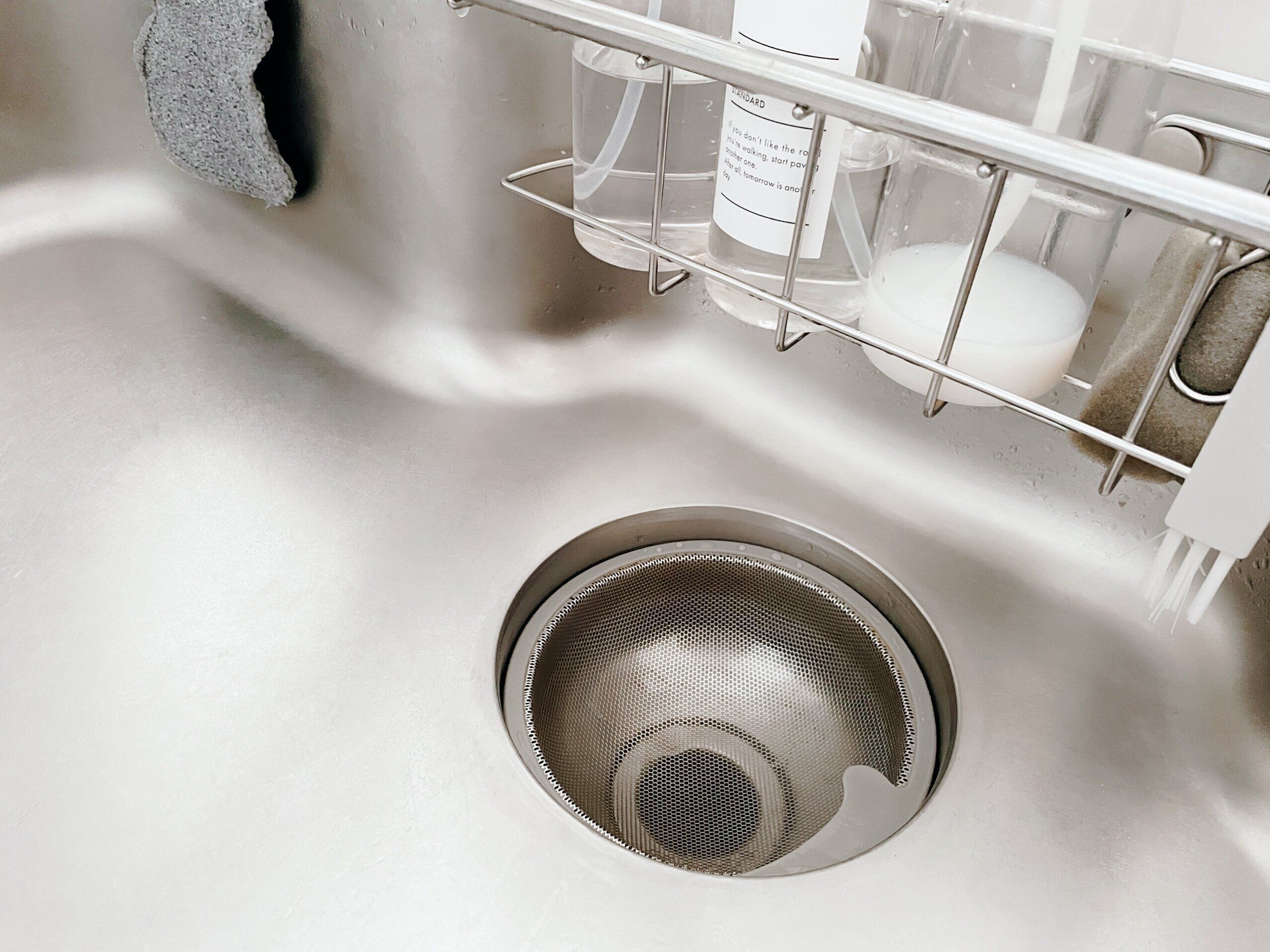 まずはキッチンシンクが詰まらないようにと築3年頃には撤去してしまったのが排水口の蓋。ゴミが溜まると見た目も悪く気になってくるのでそもそもゴミを溜めない、溜まったゴミは朝のキッチンリセットで完全に撤去。これをルールとしています。