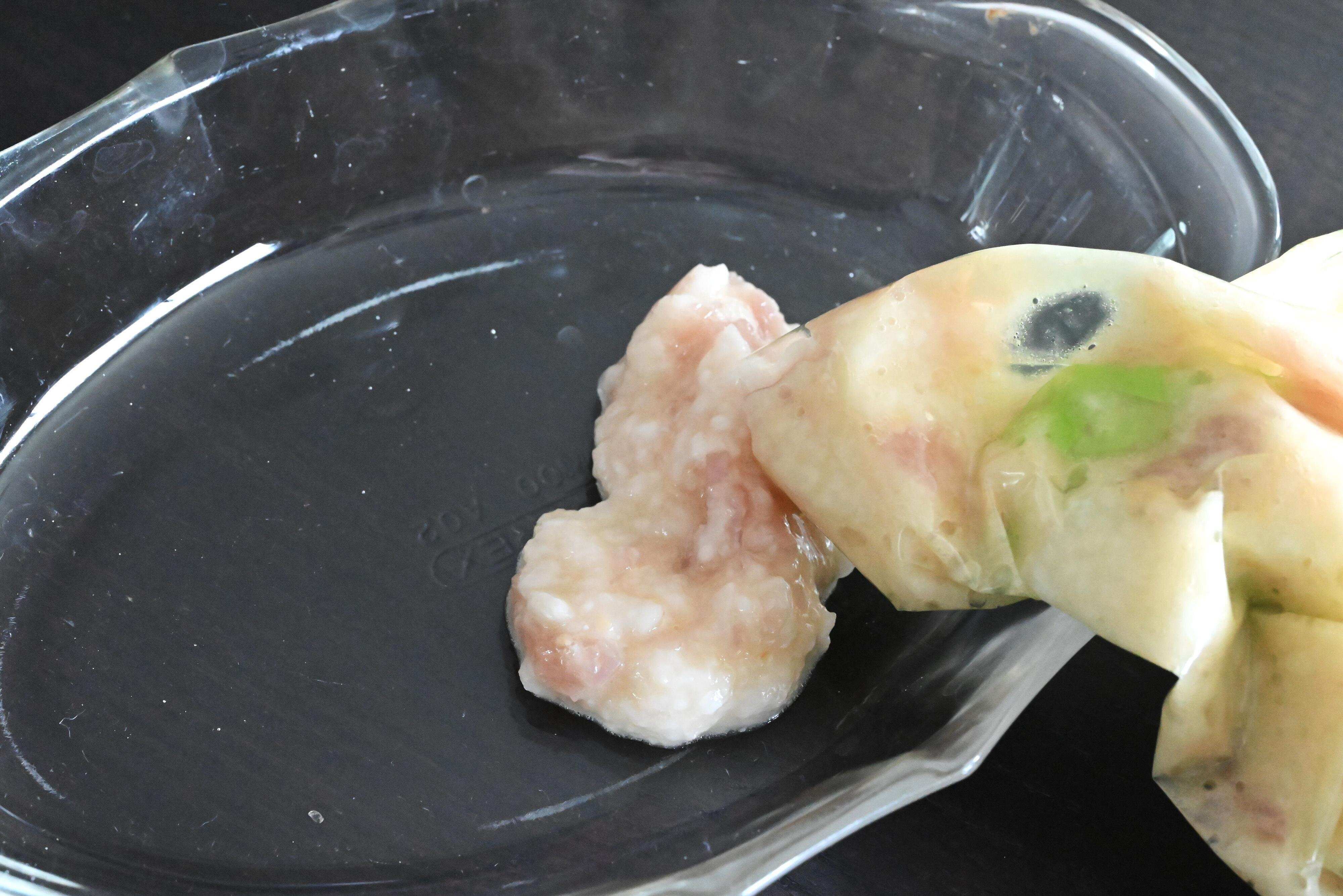 (4)袋の先端をハサミで切り落とし、耐熱容器に長芋を流し入れる。