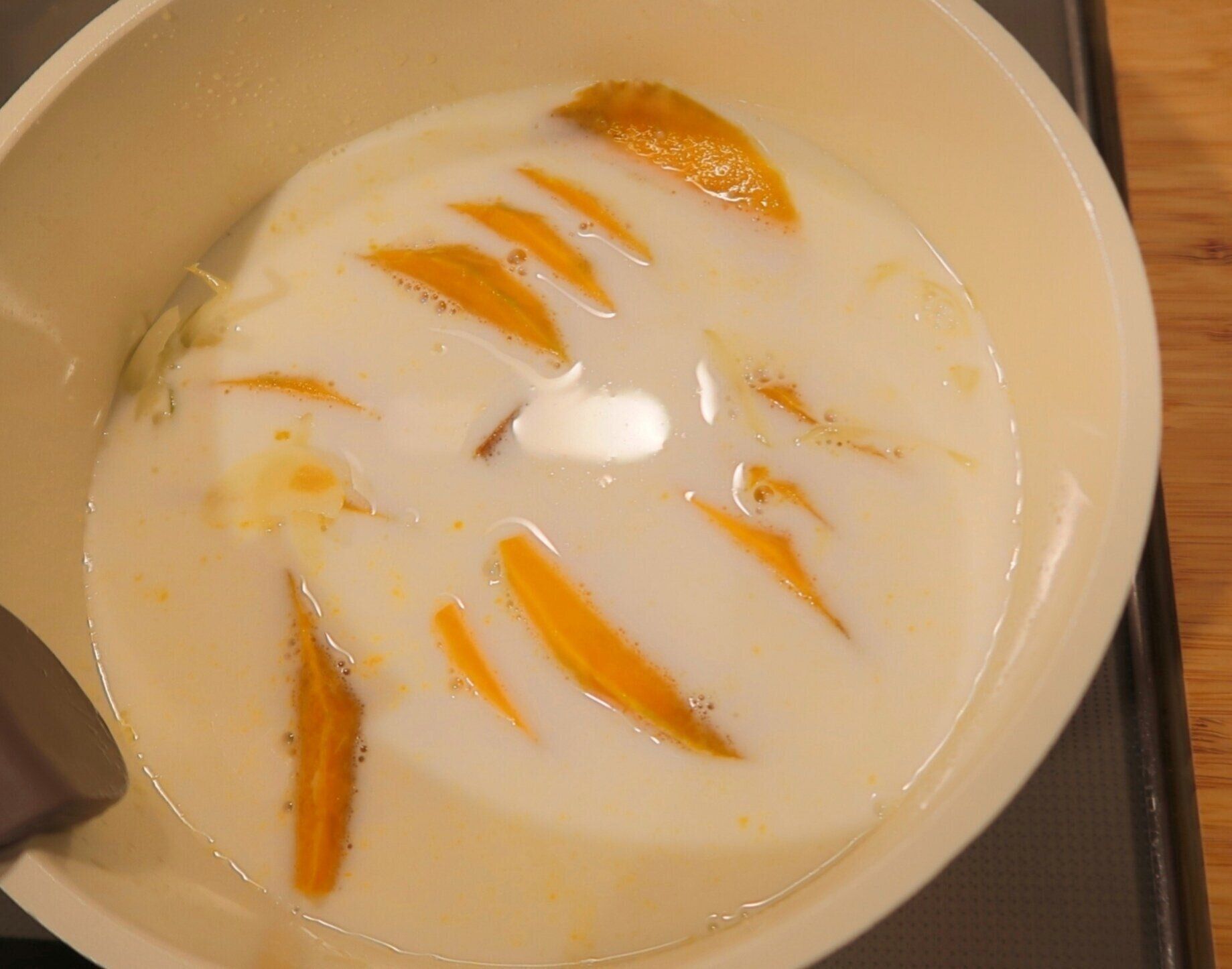 つづいて(1)のかぼちゃ、牛乳、コンソメキューブを加えます。ふつふつとしてきたら弱火にし、ふたをして約10分煮込みます。