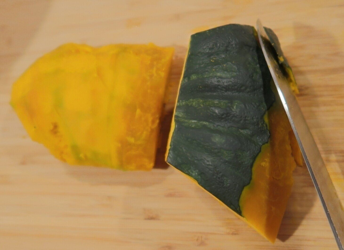 切り口を下向きにし片手でしっかりとかぼちゃをおさえながら、包丁でそぐようにして皮をむきます。緑色の部分をなるべく残さないようにすると、より色あざやかなポタージュに仕上がります!