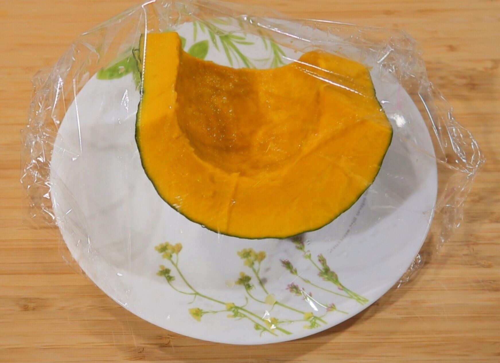 かぼちゃは種とわたを取り除きます。つづいて耐熱皿にのせふんわりとラップをかけ、600Wの電子レンジで約4分加熱します。