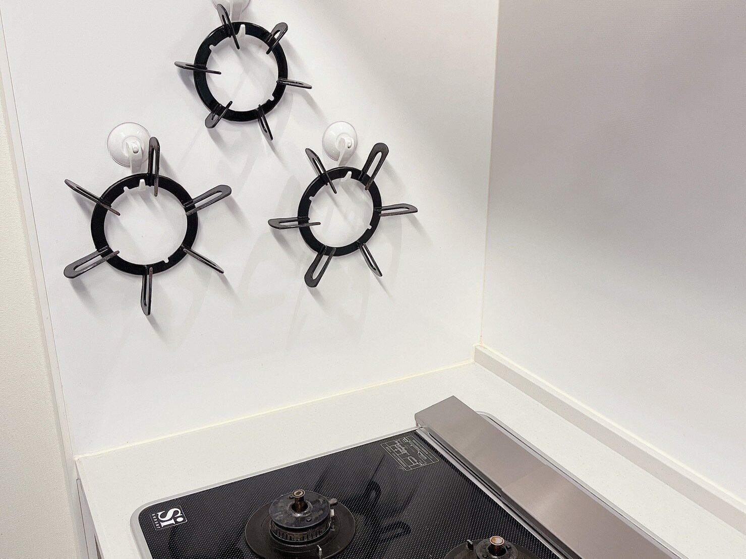 吊り下げる手段はいくつかありますが、わが家は吸盤タイプのフックを使用しています。このほかにも、磁石や強力粘着テープなどの方法もあります。ご家庭のキッチンにあわせたタイプをお選びくださいね。五徳もなかなか重みがありますので、吊り下げた際に、重みでフックなどが落下しないようにお気をつけください。