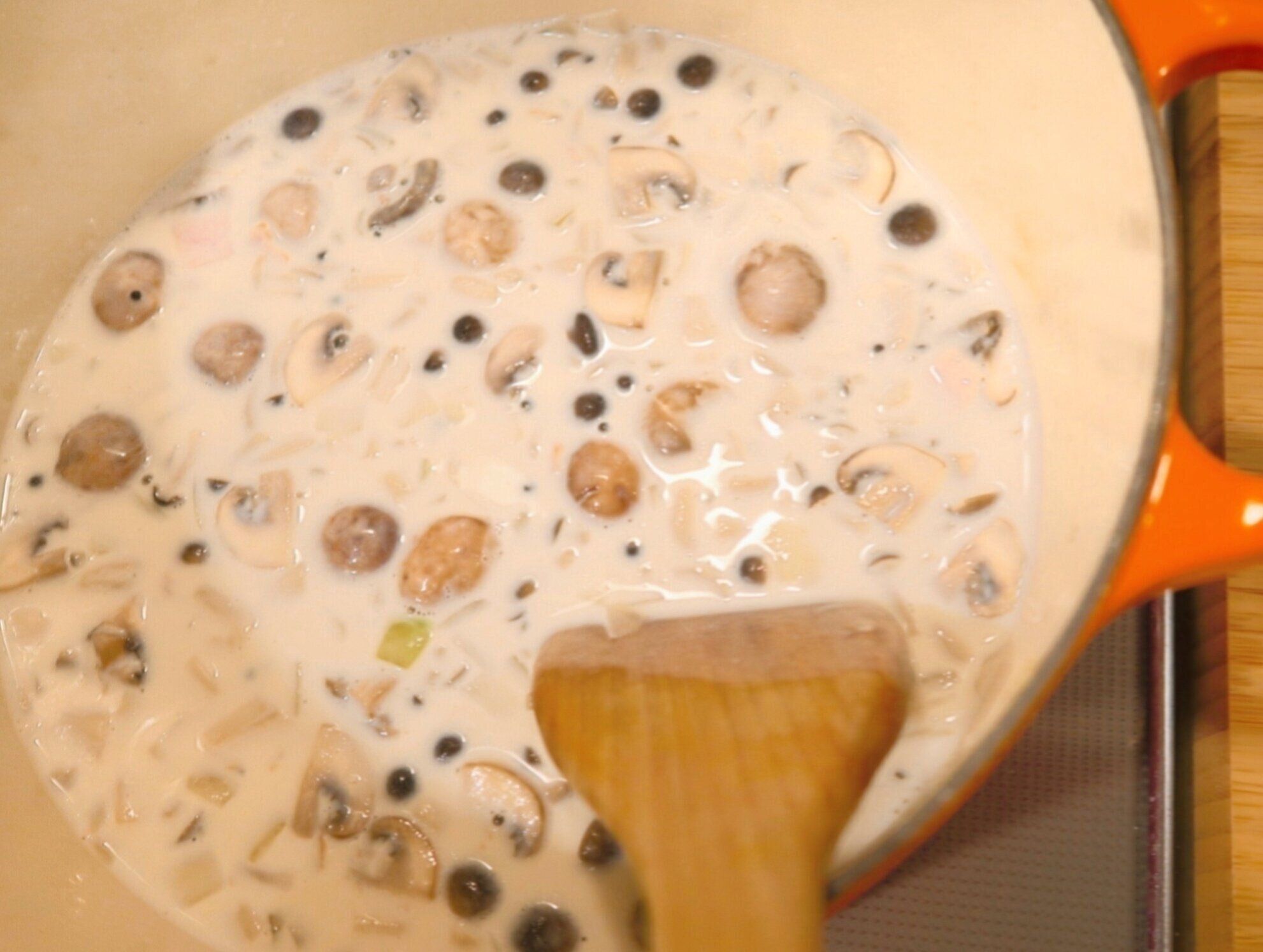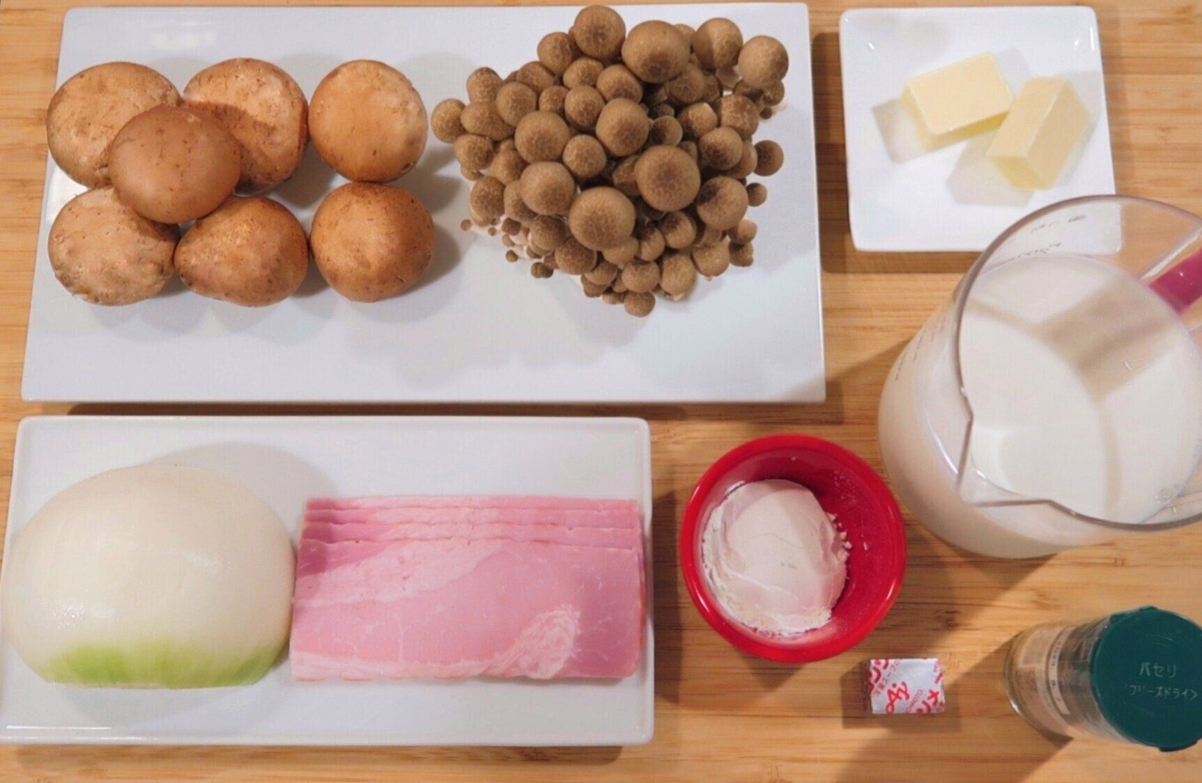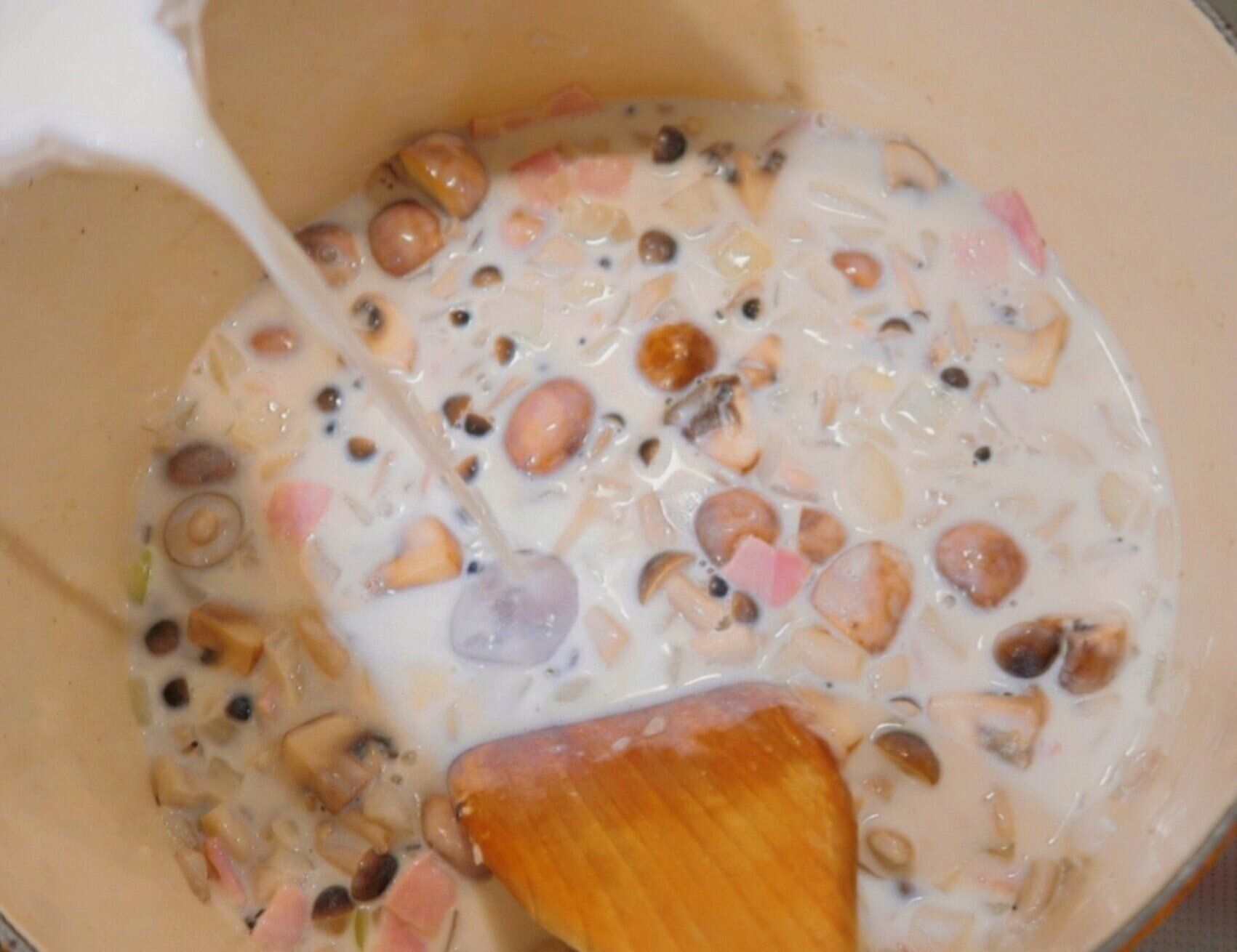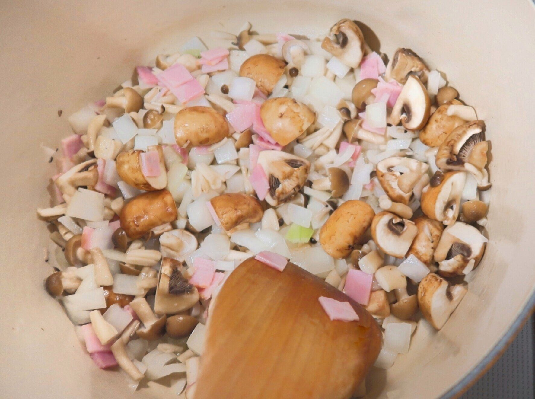 大きめの鍋にバターを中火で熱し、玉ねぎを入れ約3分炒めます。玉ねぎが透き通ったら、ベーコン、マッシュルーム、しめじを入れ約5分炒めます。じっくり炒めることで具材の旨味をひきだします!