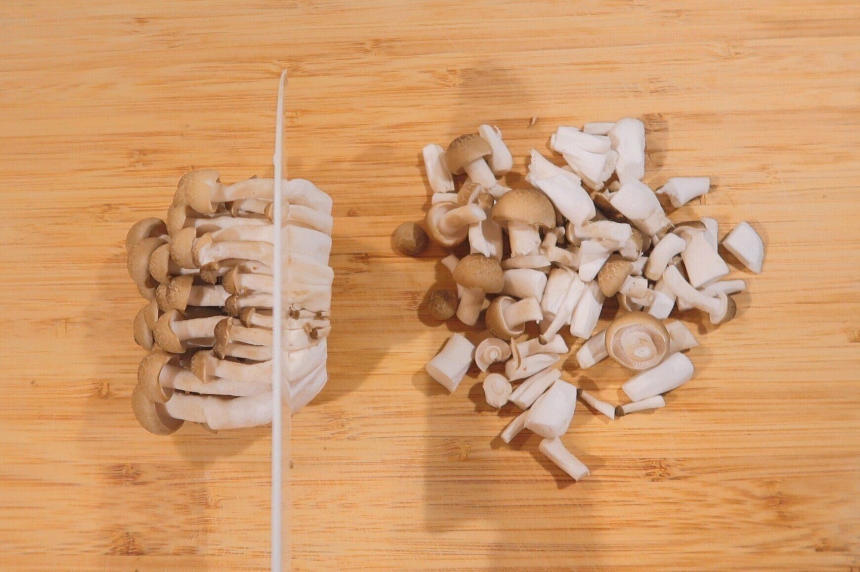 しめじは石づきを切り落とし3〜4等分の長さに切り、手でほぐします。