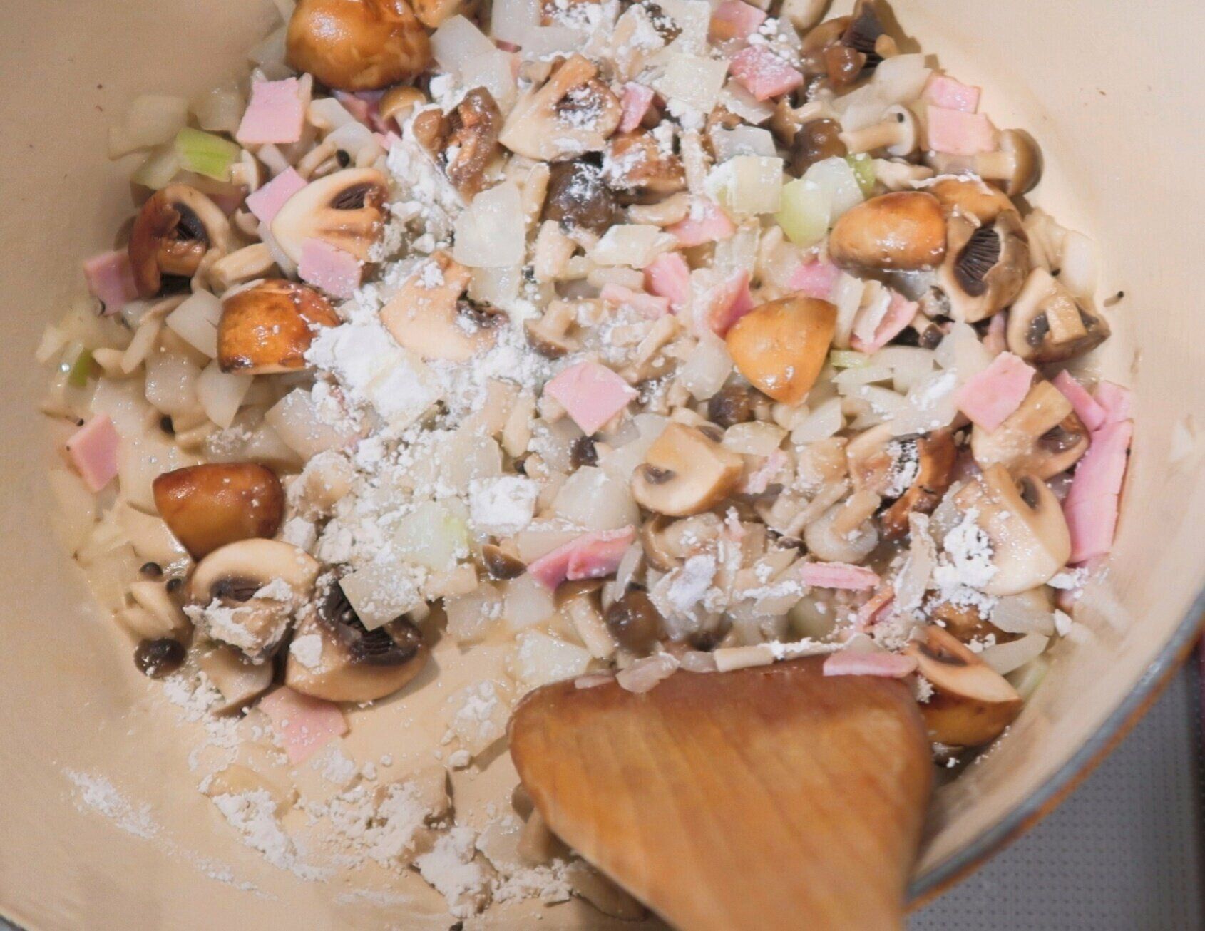 つづいて、薄力粉(大さじ1)を全体にふり入れ粉っぽさがなくなるまで炒めます。