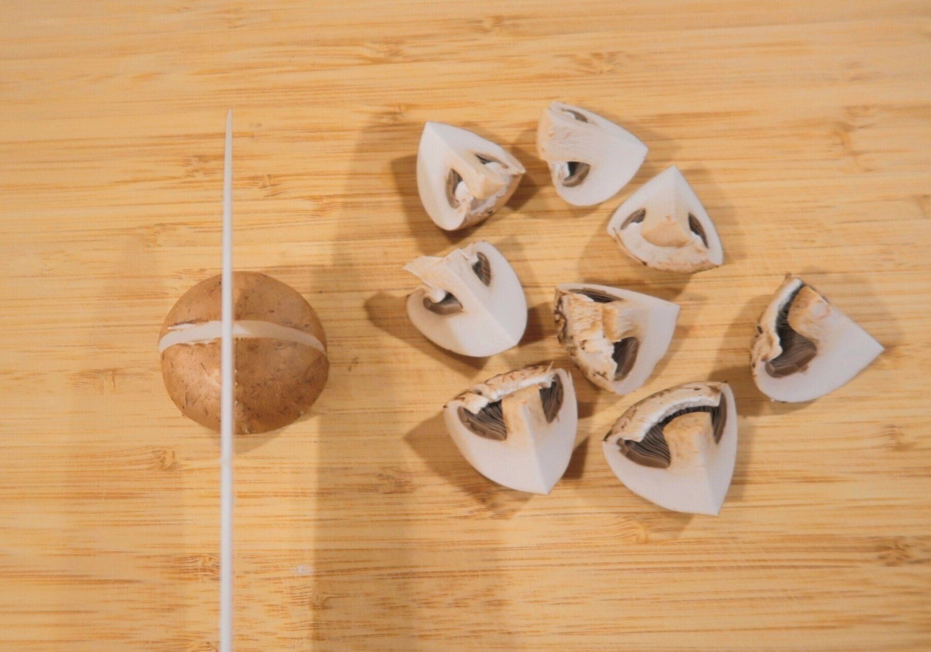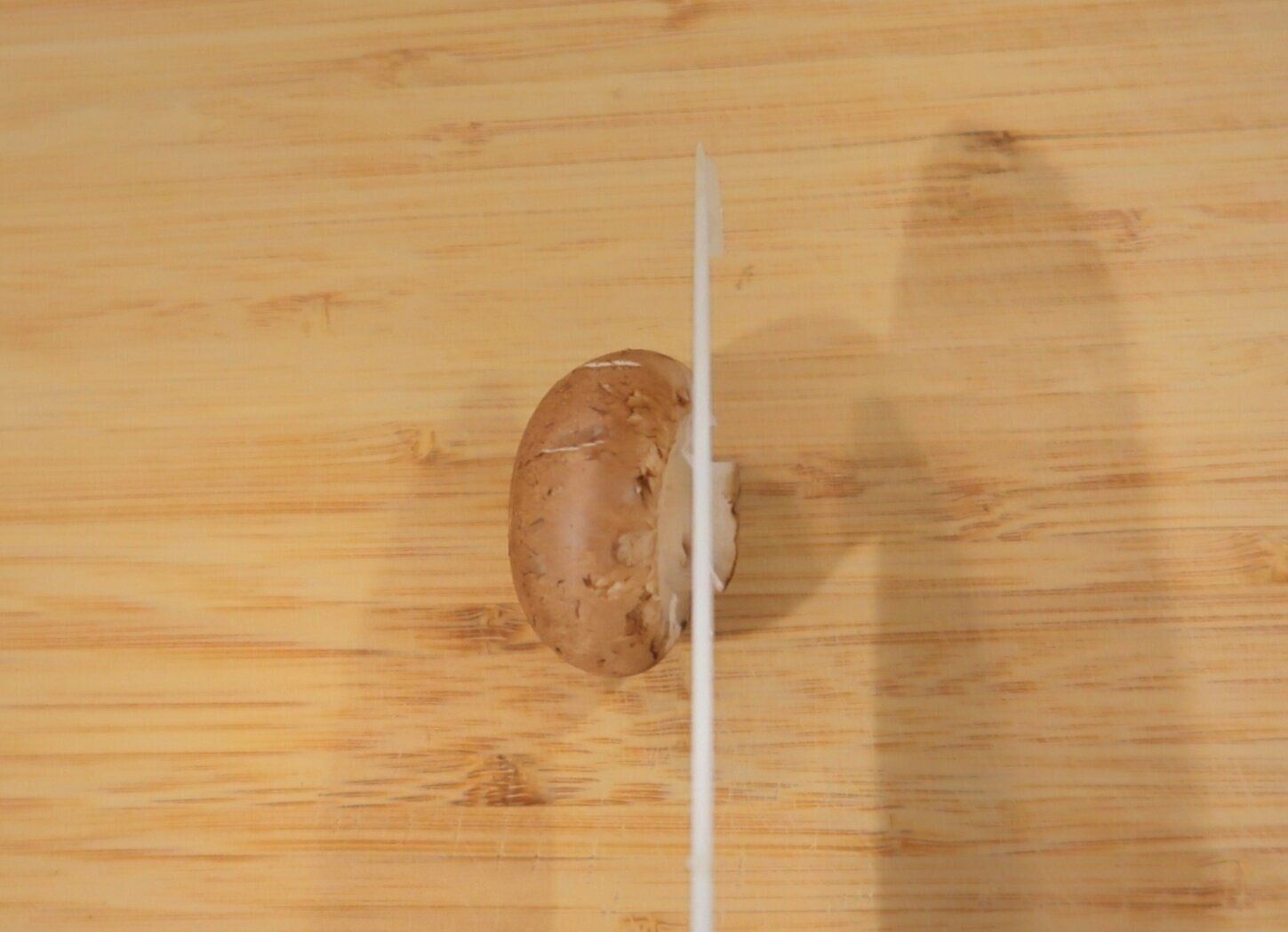 マッシュルームは、軸の先をうすく切り落とします。きのこは風味をのこすため、水で洗わないのがポイントです!土などがついている場合は、湿らせたキッチンペーパーでふき取ります。