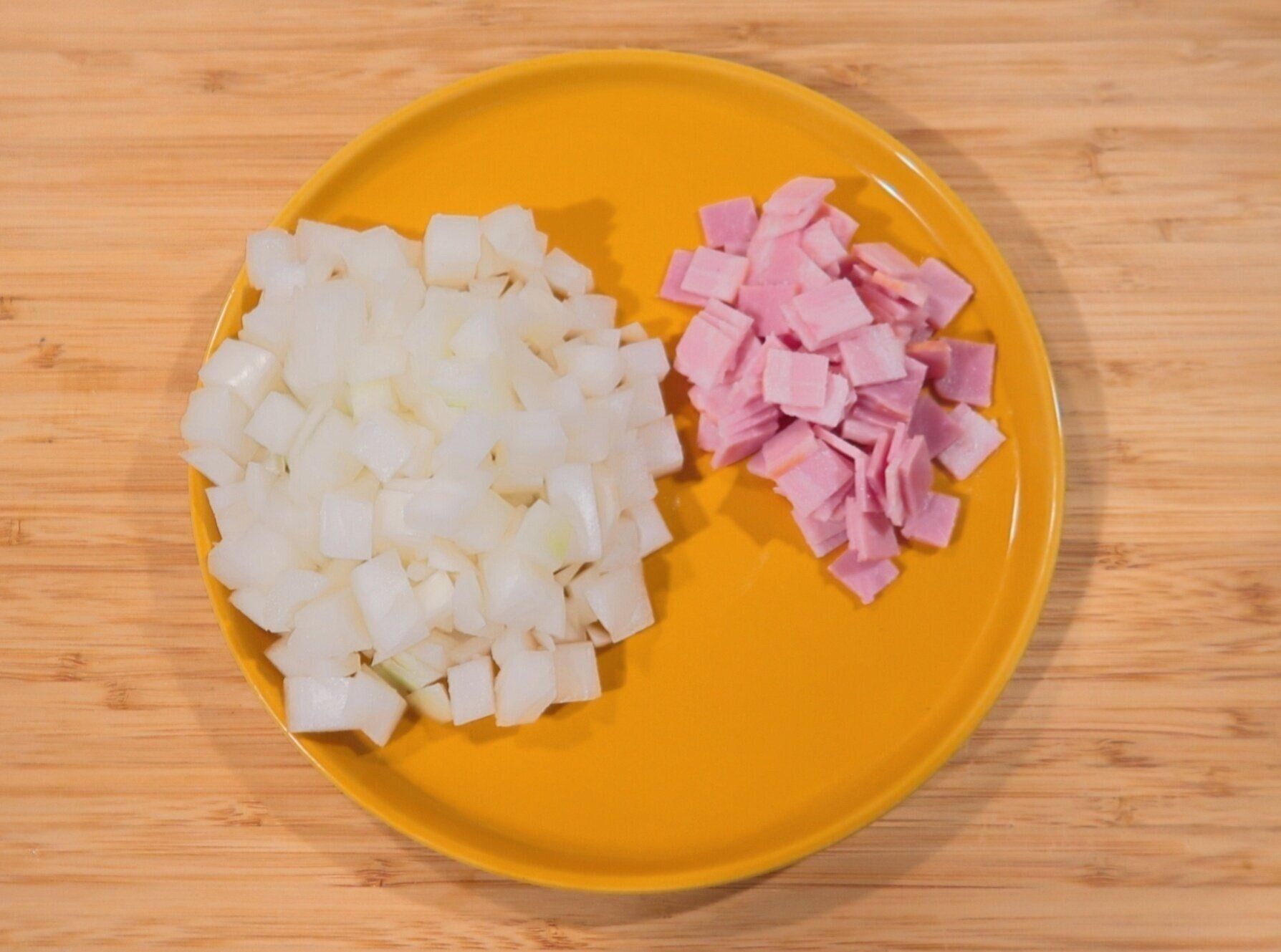 玉ねぎ、ベーコンはそれぞれ約1cm角にカットします。