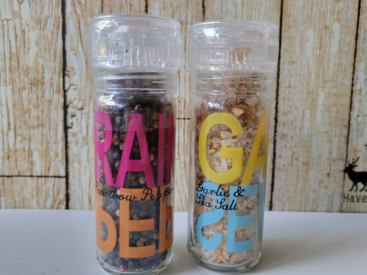 おしゃれなミルつきボトルに入った「レインボーペッパー」と「ガーリックソルト」。どちらもコスパ抜群の実力派、キッチンに常備しておきたいおすすめスパイスです。