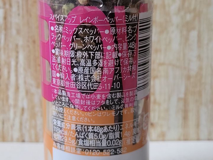 ミル付きのボトルに48gのミックスペッパーが入って、348円です。