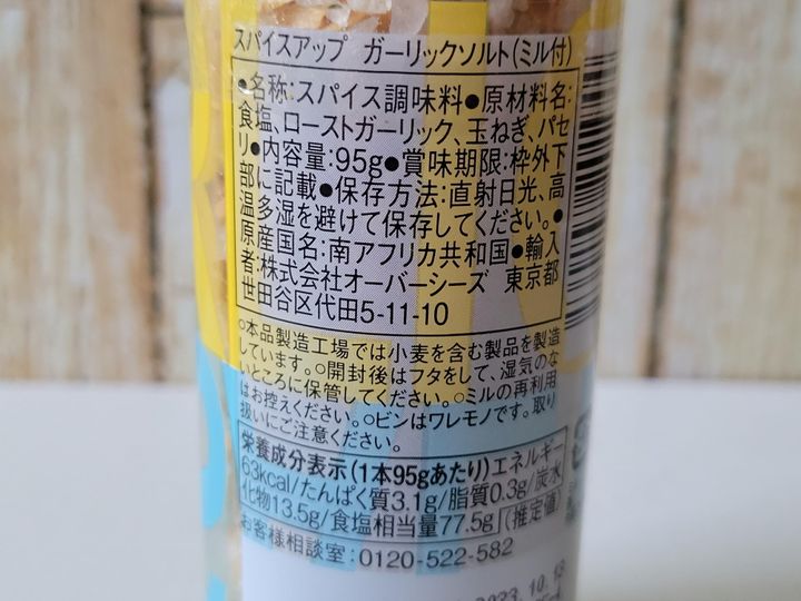 ミル付きのボトルに食塩、ローストガーリック、玉ねぎ、パセリがミックスされて入っており、内容量95gで348円です。