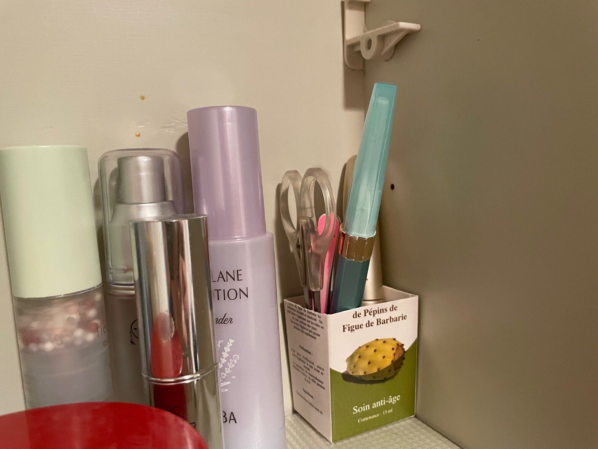 まゆげ用のはさみや小物を立てていれるのにぴったりの収納に変身しました。